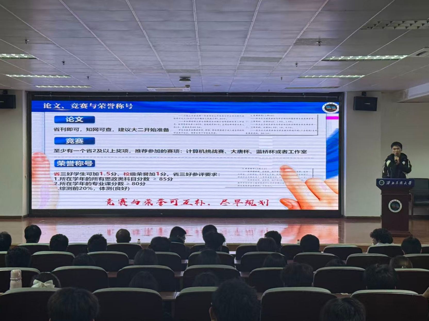 在分享环节,3位优秀学子结合自身经历,为低年级同学提供了丰富而实用的大学学习与生活指南。化工学院廖光辉同学从技能备考、科研训练切入,导学弟学妹正确看待失败,在多元尝试中实现自我突破。电气工程学院汪肖杰同学阐述��绩点提升、竞赛突破、团学工��三位一体的成长策略。数学与计算机科学学院曹弦同学立足专业背景,聚焦高等数学和计算机语言主干课程学习,分享了自己在路径方法和目标达成等方面的益经验�