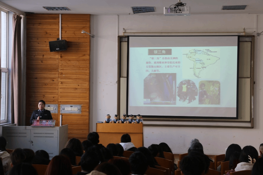 靳亚男警官从毒品的来源、国际禁毒形式、常见毒品种类、毒品的危害等方面讲解了毒品预防相关知识,向学生重点介绍了第三代毒品,即“新精神活性物质”。靳亚男警官向学生详细阐述新型毒品的形态和危害,使同学们充分认识到生活中潜藏的危险因素,以及吸毒、贩毒给身心健康所带来的严重危害,教育引导同学们树立正确的人生观、价值观,提高禁毒意识,远离毒品危害。