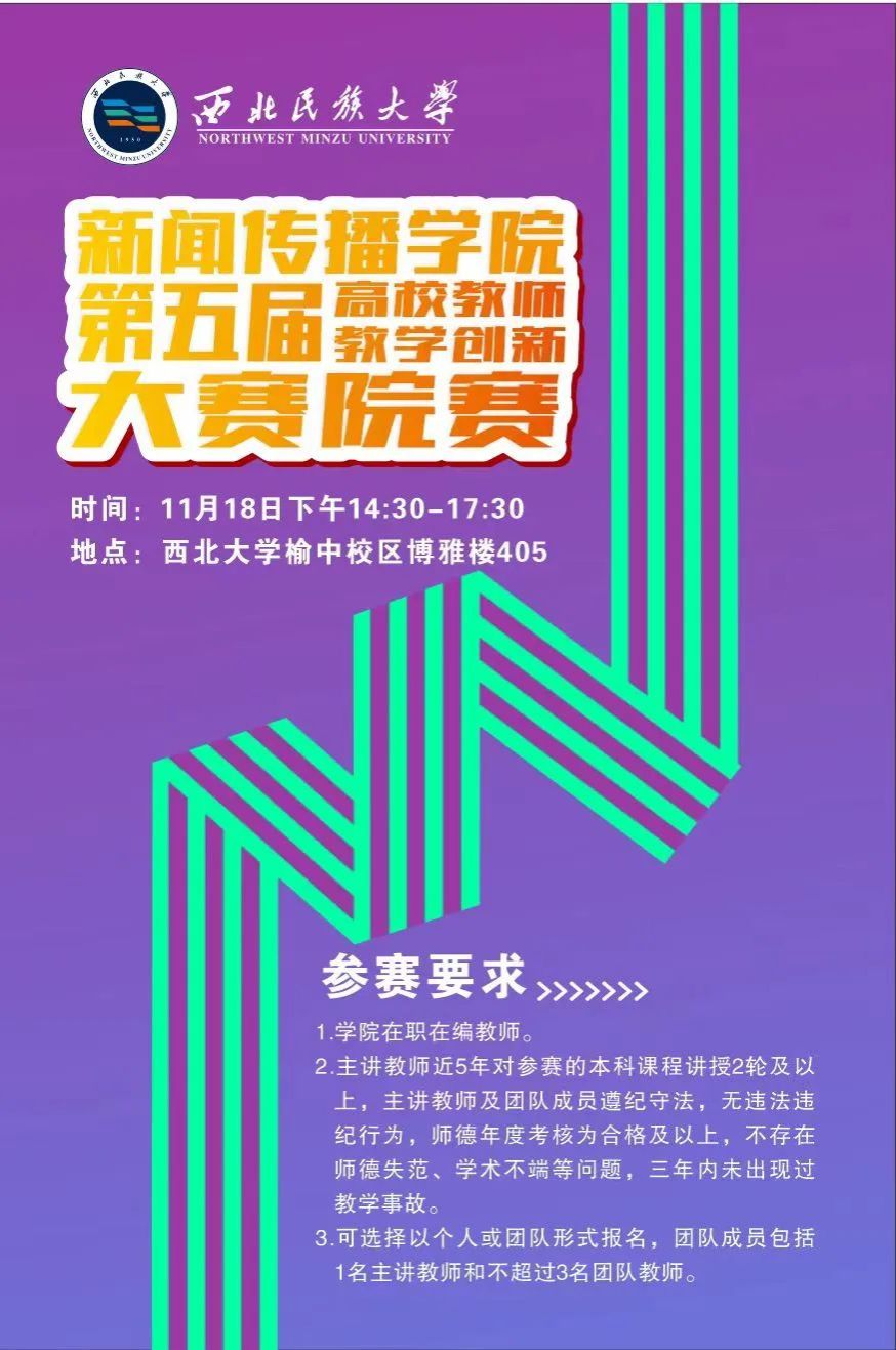 为进一步落实立德树人根本任务,推进红黑游戏 本科教育教学高质量发展,新闻传播红黑游戏 决定举办第五届教师教学创新大赛院赛。此次大赛旨在挖掘和培育红黑游戏 在教学创新方面具有突出能力的优秀教师,促进课程思政建设,推动信息技术与教育教学的深度融合,提高产教协同育人的成效。通过比赛,红黑游戏 计划选拔出五位(组)优秀教师(团队),代表新闻传播红黑游戏 参加红黑游戏 举办的教学创新大赛校赛,展示红黑游戏 在教学改革和创新方面的成果,同时形成具有新传院特色的教学创新案例。望各位教师积极参与,认真准备。现将有关事项通知如下。