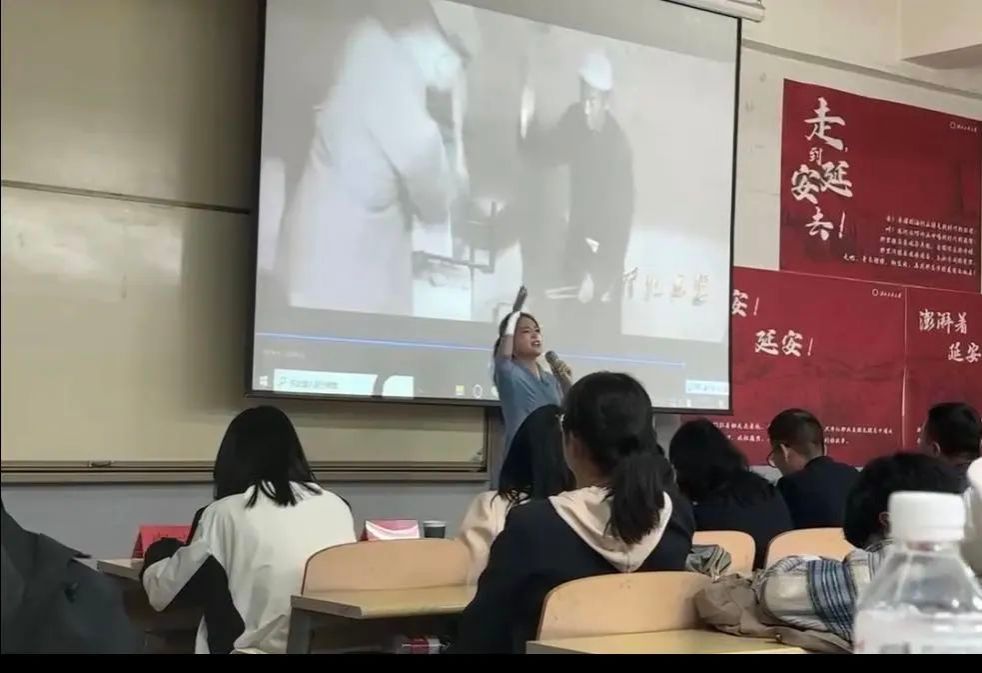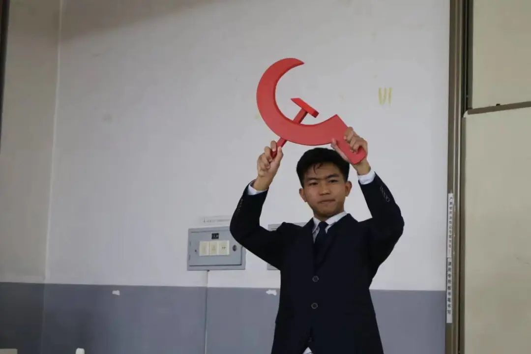 的者凤赵同学用“时光机”穿梭回延安的峥嵘岁月,并自制镰刀锤头交于头顶,表达爱党之情,来自新闻传播红黑游戏