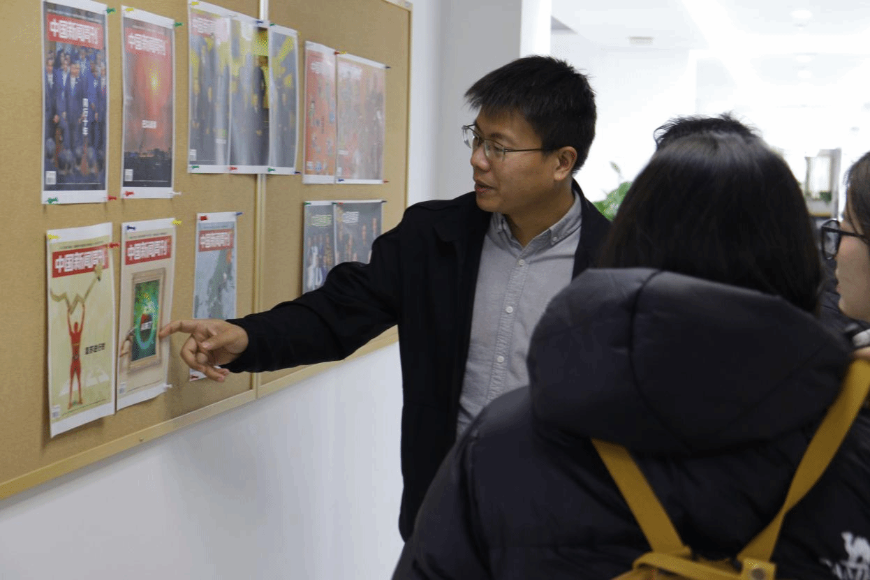 (中新社相关负责人向实践团队介绍其杂志封面)