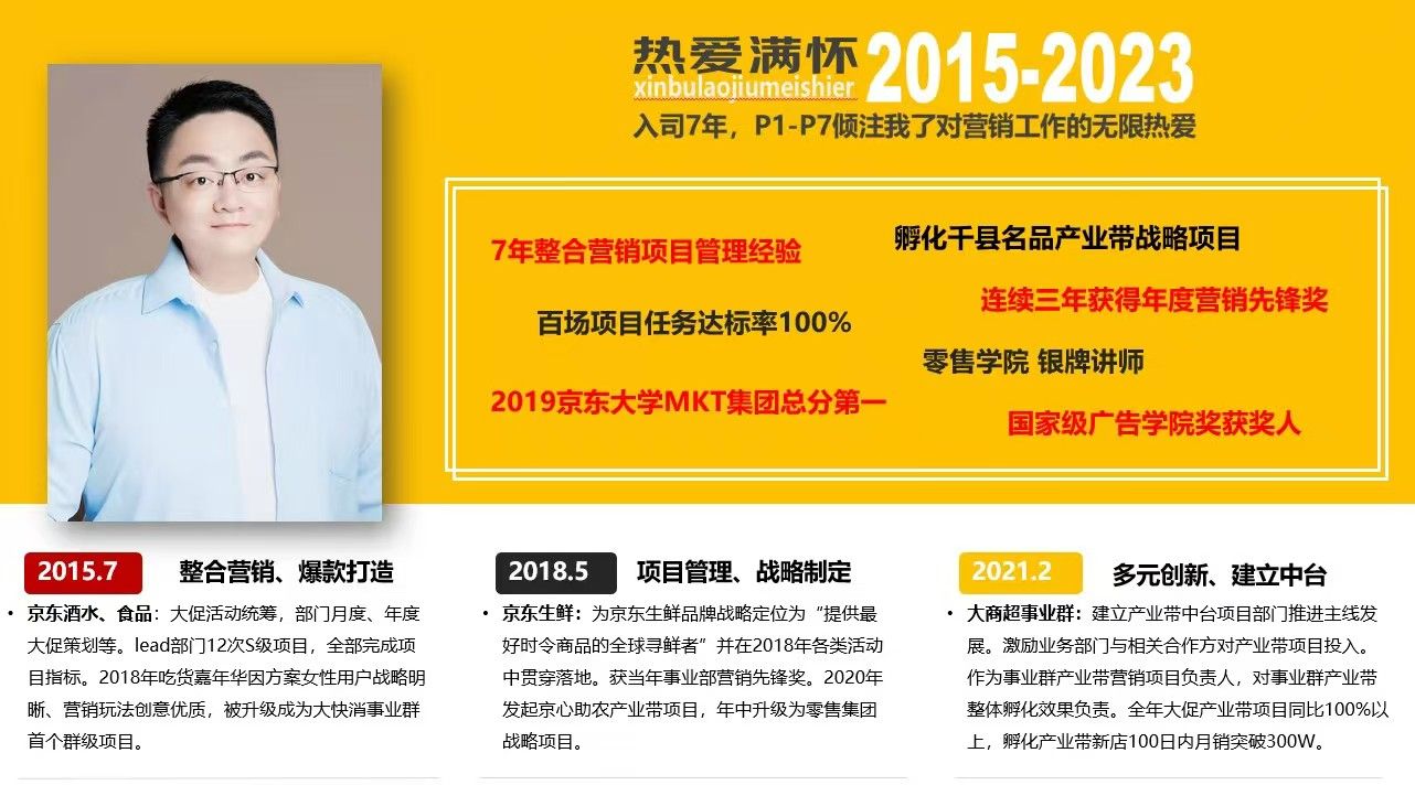 2011级广告学班长。本科毕业至今就职京东集团9年,现职级副总监。操盘百场项目实战任务达标率100%;京东大学银牌讲师(品牌与创意营销、时势营销方向);多项集团战略项目发起人及负责人;2020年-2021年疫情期间全网发布《告全国农人书》发起京心助农项目,帮助150万户农人卖出超过3亿件农货,帮助农人共克时艰。项目当年登央视新闻联播3次、焦点访谈1次、央视新闻等央媒86次;