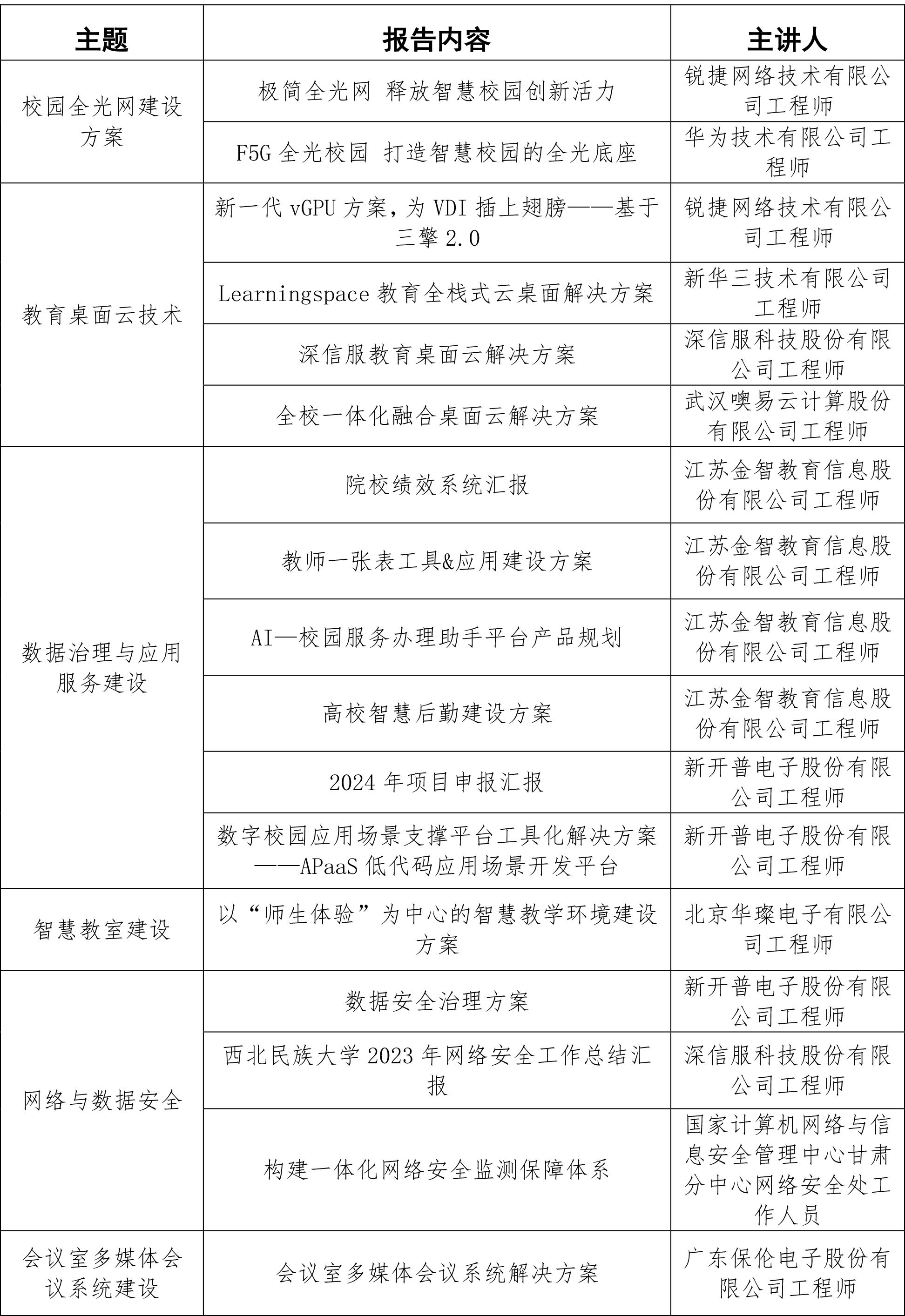未来信息化建设与工作人员业务能力发展,内容涉及校园全光网建设方案、教育桌面云技术、数据治理与应用服务建设、智慧教室建设、网络与数据安全以及会议室多媒体会议系统建设等六个主题,培训授课具体内容如下:
