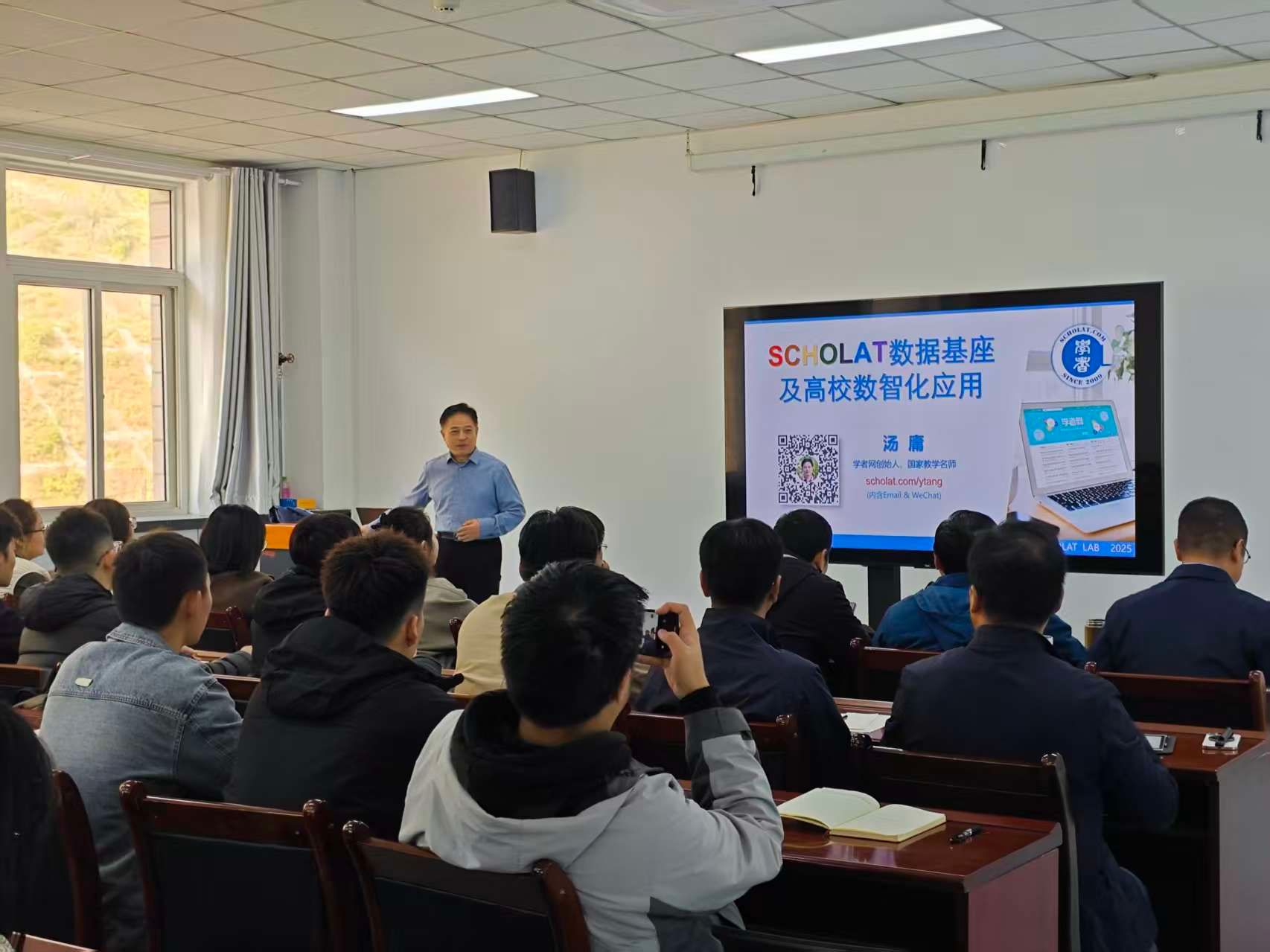 部分教师和研究生参加了此次报告会。汤庸教授系统阐述了其团队在“SCHOLAT数据基座”与“学者大模型”方面的研究进展与建设成果。重点介绍了以学者为中心的学术图数据构建体系,指出该数据基座深度融合了学者、论文、科研项目、课程等多类学术实体及其间复杂关联关系,构建了规模宏大、结构完整的学术知识图谱。基于此数据基础,进一步研发了面向学术服务场景的智能模型,并在学者画像构建、学术智能问答等多个方向开展了深入的数智化应用探索,为高校科研创新与教学实践提供了全新的数据驱动范式与智能化支持。报告结束后,汤教授与现场师生进行了积极互动,并对师生们提出的学术问题给予了耐心细致的解答。整场报告内容翔实、视角前瞻,现场气氛热烈,受到了与会师生的一致好评。