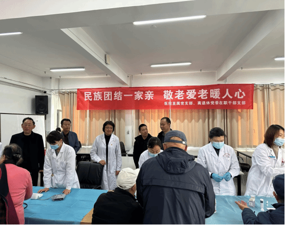为深入开展民族团结进步宣传月及敬老月宣传活动,铸牢中华民族共同体意识,10月30日上午,医院直属党支部联合离退休党委在职干部支部在老年大学教室共同举办“民族团结一家亲 敬老爱老暖人心”健康宣教义诊活动,让退休职工在家门口享受暖心医疗服务。
