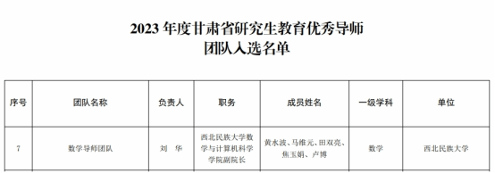 数学导师团队(负责人:刘华)获评甘肃省研究生教育优秀导师团队。