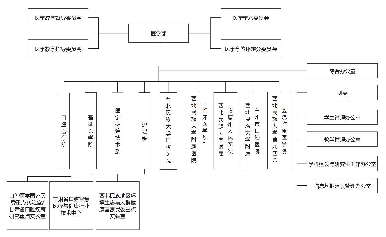 医学部现有临床医学、口腔医学、护理学、医学检验技术4个本科专业,有临床医学专业学位、护理硕士专业学位和医学人类学3个学位授权点。医学部有临床医学、口腔医学、护理学和医学检验技术四个本科专业;有临床医学、护理学专业硕士学位和医学人类学三个硕士学位授权点。口腔医学和临床医学专业通过教育部专业认证,口腔医学专业获批省级特色专业,临床医学专业为国家民委重点学科;口腔医学和临床医学获批甘肃省一流本科专业,临床医学专业获批省级课程思政示范专业;有甘肃省口腔实验教学示范中心;人体解剖学与组织胚胎学、口腔内科学、口腔基础医学三个省级教学团队;组织学与胚胎学、牙体牙髓病学、检体诊断学、口腔粘膜病学、妇产科护理学、医学微生物学、生物化学、药理学、病理生理学、健康评估10门省级一流课程。