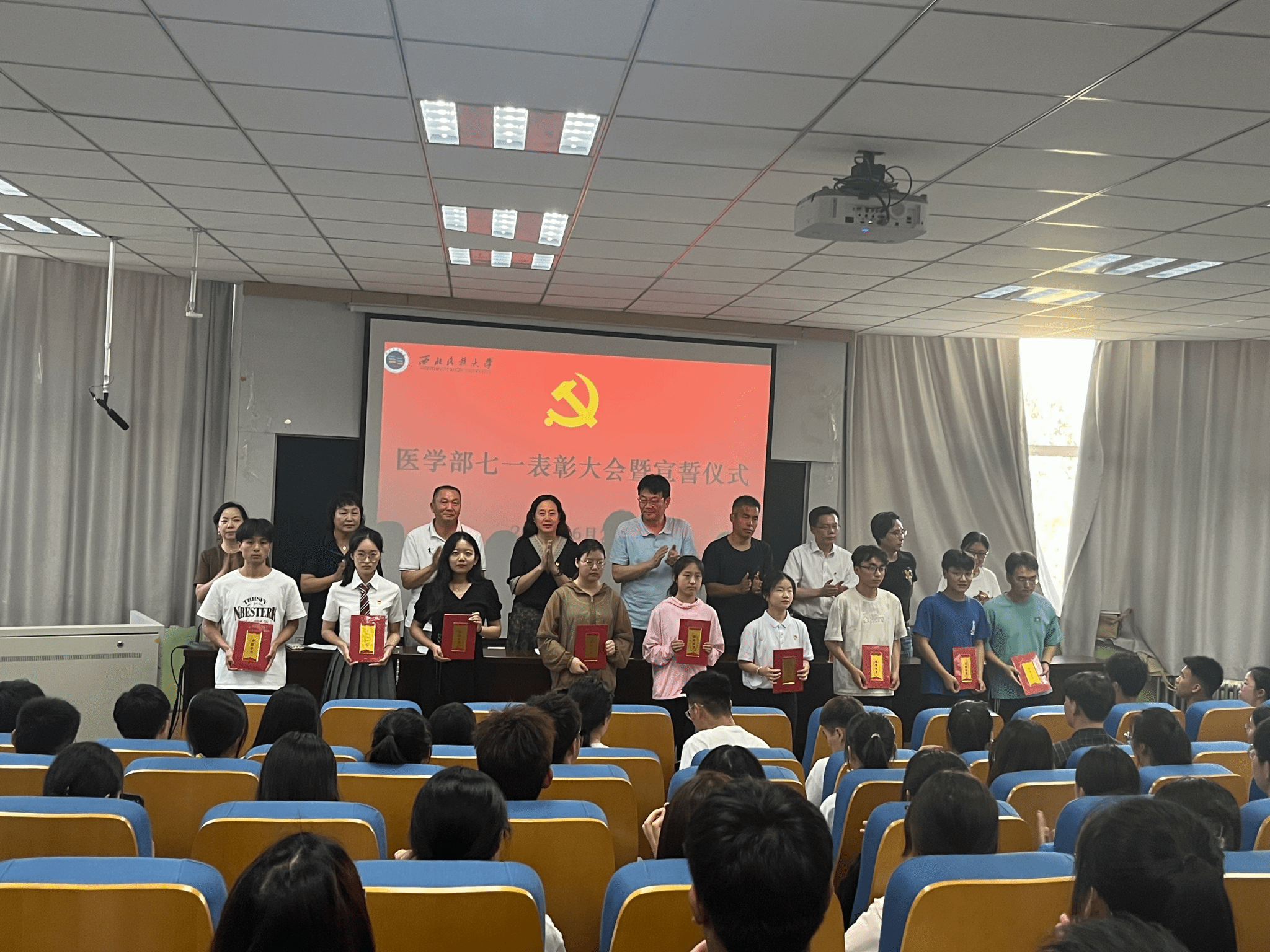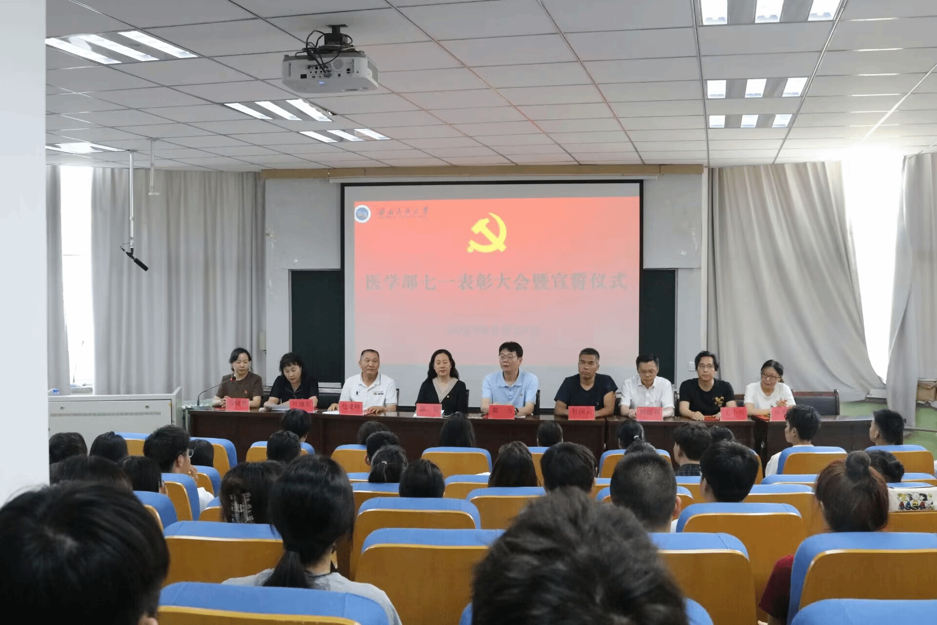今年是中国共产党成立102周年,为推动学习贯彻习近平新时代中国特色社会主义思想主题教育走深走实、见行见效,进一步激励广大党员奋发有为,建功立业,医学部在医学楼会议室召开“七一”表彰大会暨入党宣誓仪式。医学部党委委员、师生党员及部分入党积极分子参会。学部党委副书记叶瑜英主持会议。