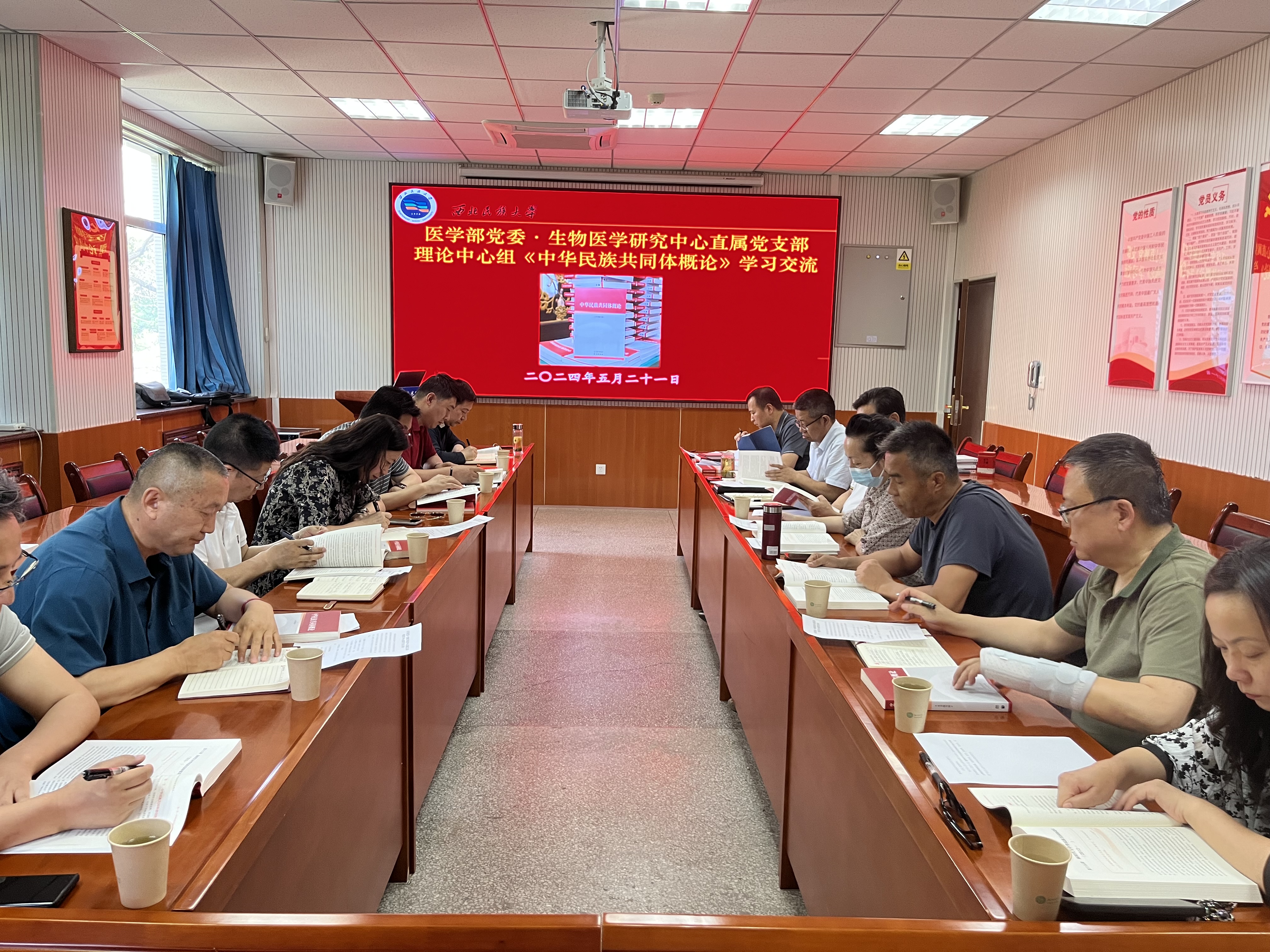 5月21日下午,医学部党委联合生物医学研究中心直属党支部理论学习中心组,在生物医学研究中心二楼会议室召开理论学习中心组专题联学会议,深入学习研讨《中华民族共同体概论》教材。双方中心组成员结合工作实际交流学习体会,医学部党委书记主持联学。