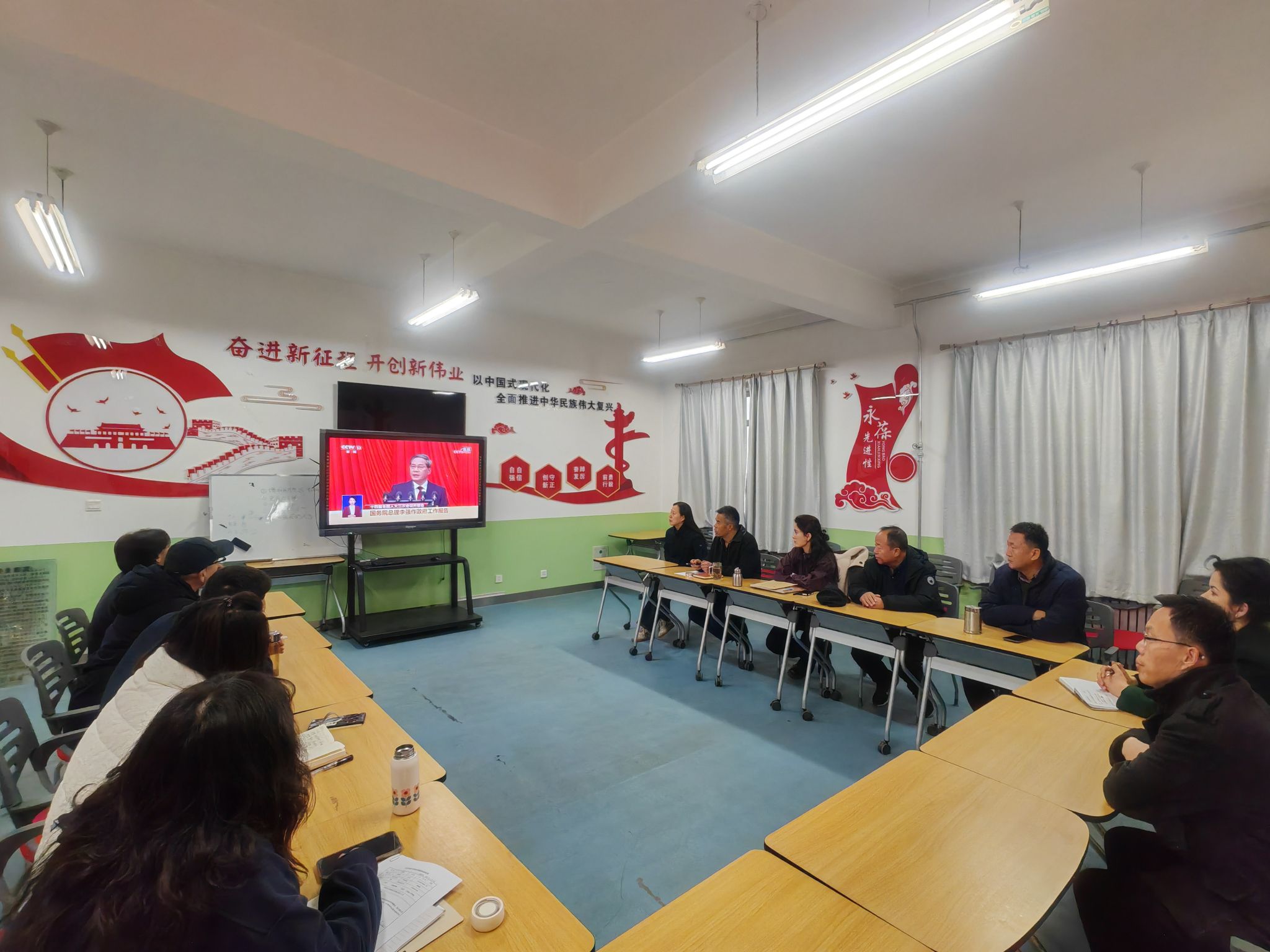 会堂隆重开幕,李强总理作《政府工作报告》。医学部党委理论学习中心组(扩大)在操场208会议室集中收看了会议实况直播,认真聆听李强总理的报告。