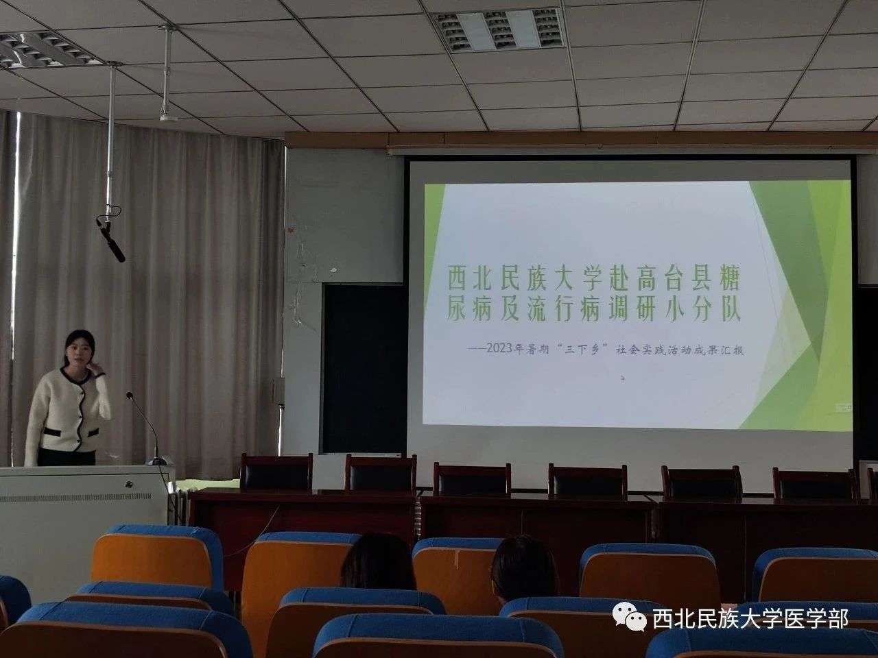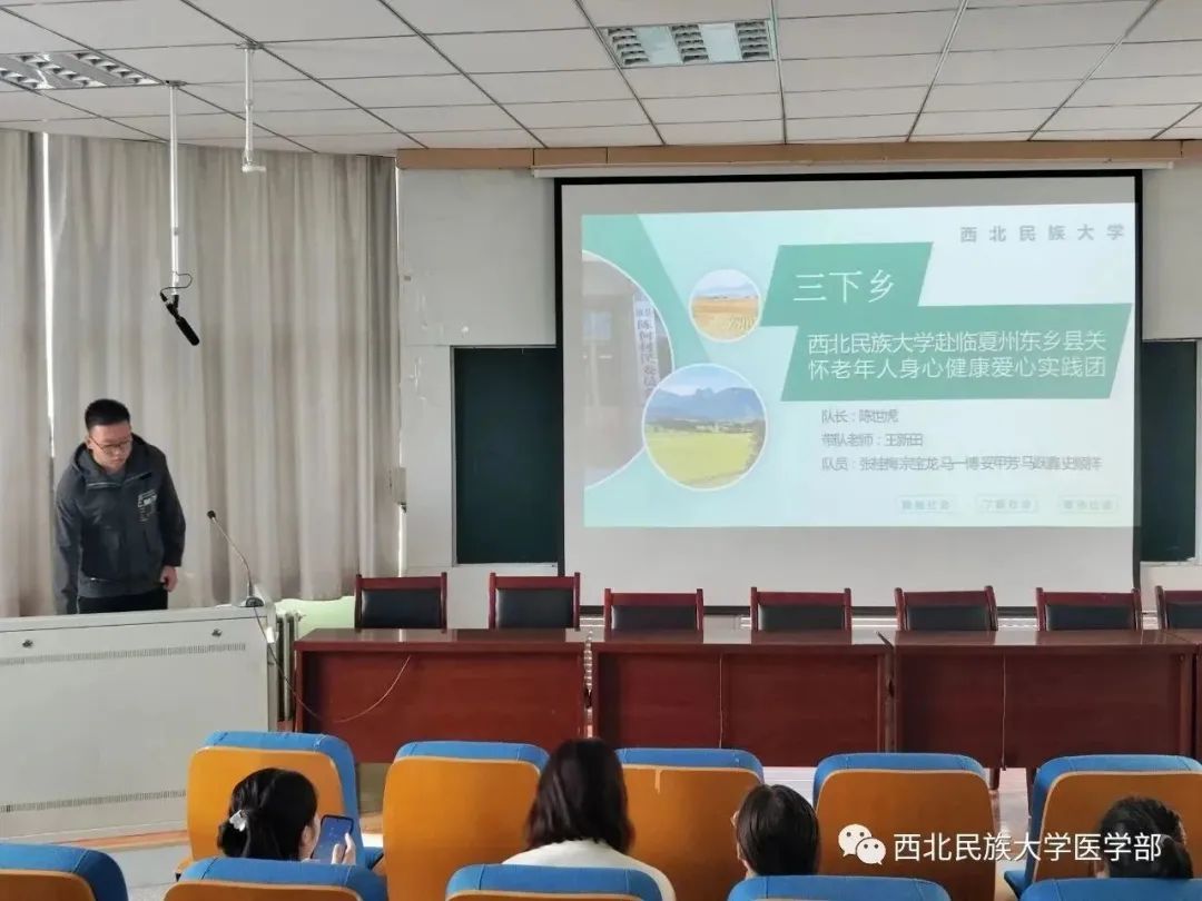 随后,13支代表队依次作了社会实践成果分享。方镜臣同学分享了张掖高台县糖尿病及流行病实践团的实践经历,他们深入高台县城区部分卫生服务中心、巷道镇卫生院及镇辖13个村,对糖尿病人开展随机调查问卷和数据采集工作。