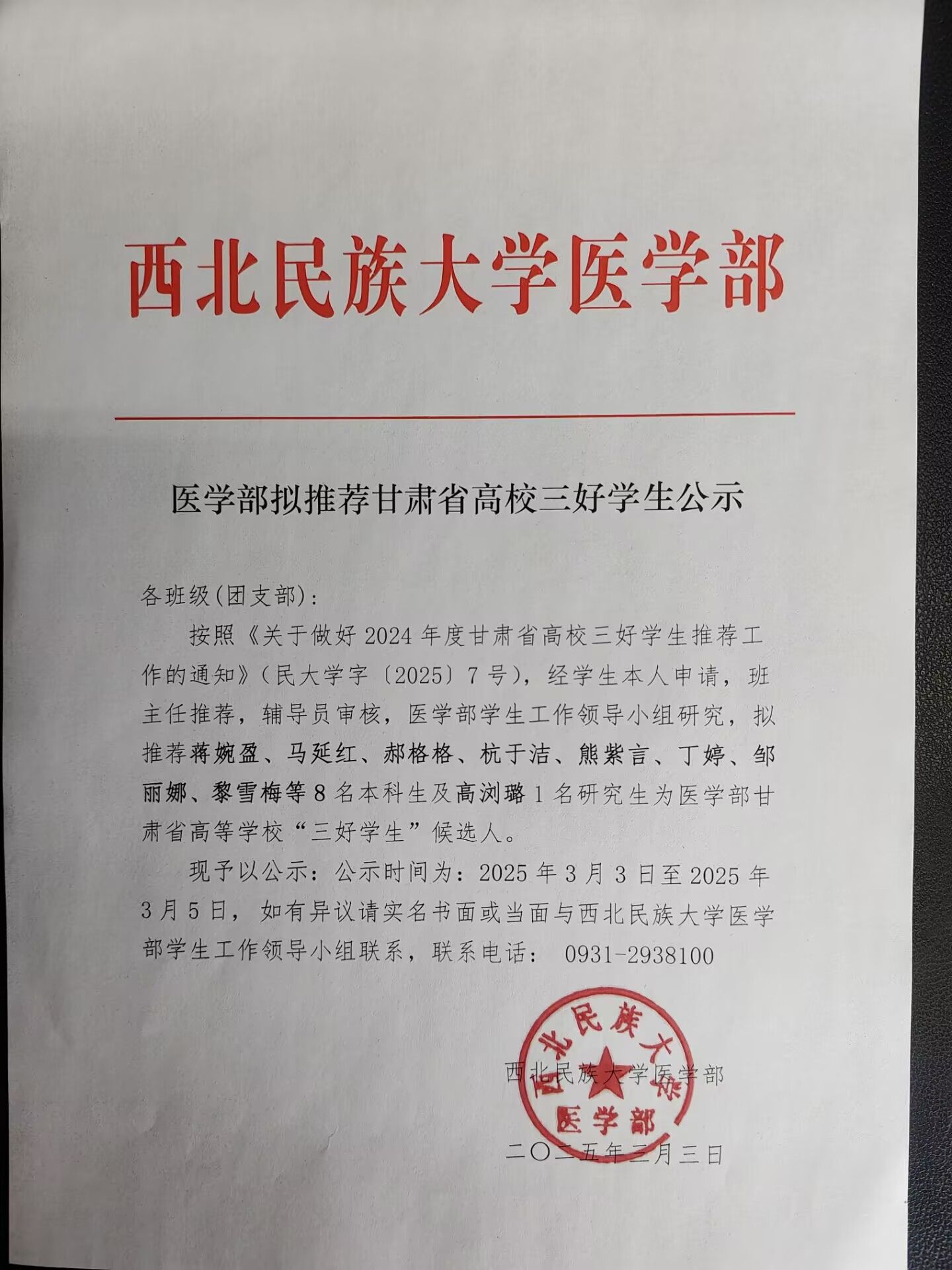 医学部拟推荐甘肃省高校三好学生公示