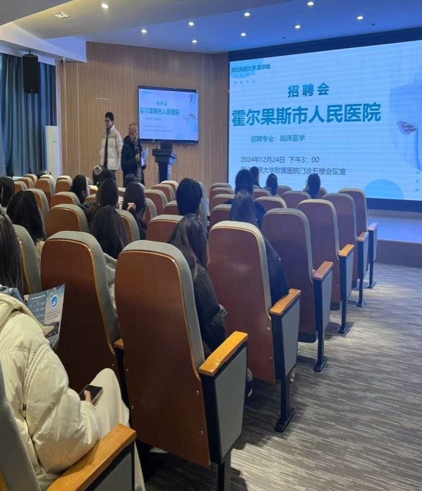12月24日下午,医学部邀请霍尔果斯市人民医院在红黑游戏 附属医院会议室开展了专场招聘会,近200余名2025届临床医学专业应届毕业生参加了活动。霍尔果斯市人民医院副院长叶尔布拉·道肯,医务部主任叶东亮分别介绍了医院现状,岗位需求以及福利待遇,并就学生提出的问题展开深入交流。