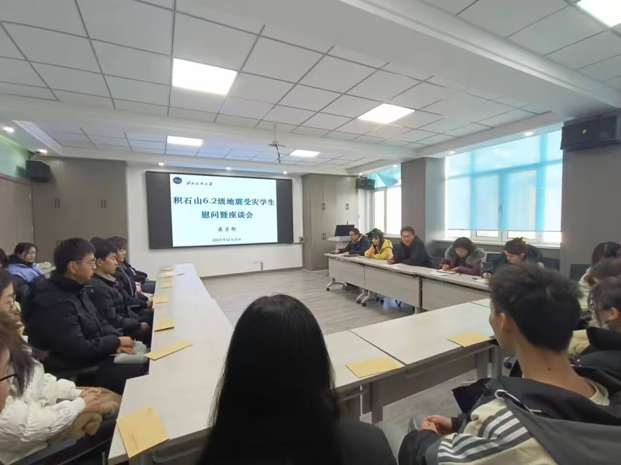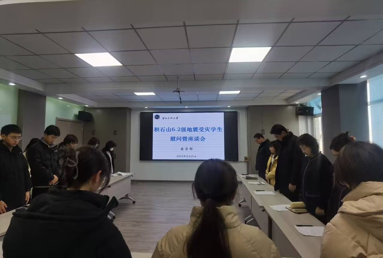 党委的统一部署,医学部党委高度重视学生家庭受灾情况,第一时间组织班导师开展地震灾区学生摸排工作,做好家庭受灾学生思想政治工作,全方位做好受灾家庭学生专项资助和帮扶工作。12月21日上午,医学部在医学楼7楼会议室组织召开地震受灾学生慰问座谈会。学部党委书记郭力,党委副书记、五级职员叶瑜英,学生管理办公室、辅导员出席了座谈会,17名地震家庭受灾学生代表应邀参加。