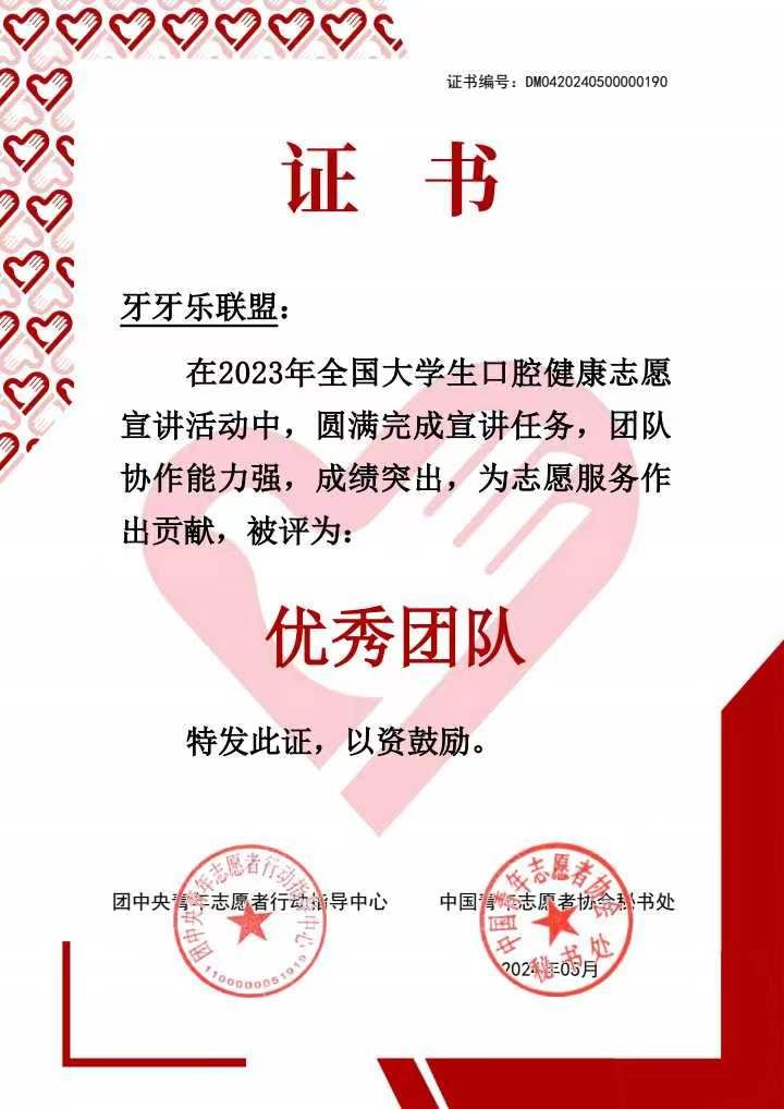 医学部张轩、吴凌莉老师指导的“爱牙石榴娃”和“牙牙乐联盟”志愿服务队,在全国范围内遴选的1000支大学生口腔健康志愿宣讲团队中脱颖而出,荣获“优秀团队”荣誉称号。
