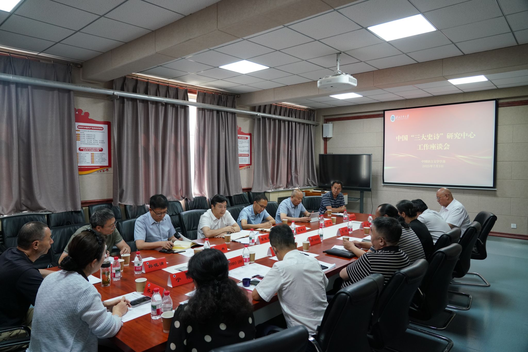 7月3日下午,中国语言文学学部召开中国“三大史诗”研究中心工作座谈会,校党委书记张俊豪、副校长王建华出席会议,科研处负责人、中国语言文学学部相关负责人、中国“三大史诗”研究科研团队成员齐聚一堂,总结研究成果、梳理发展路径,为推动中国“三大史诗”研究再上新台阶凝聚共识。