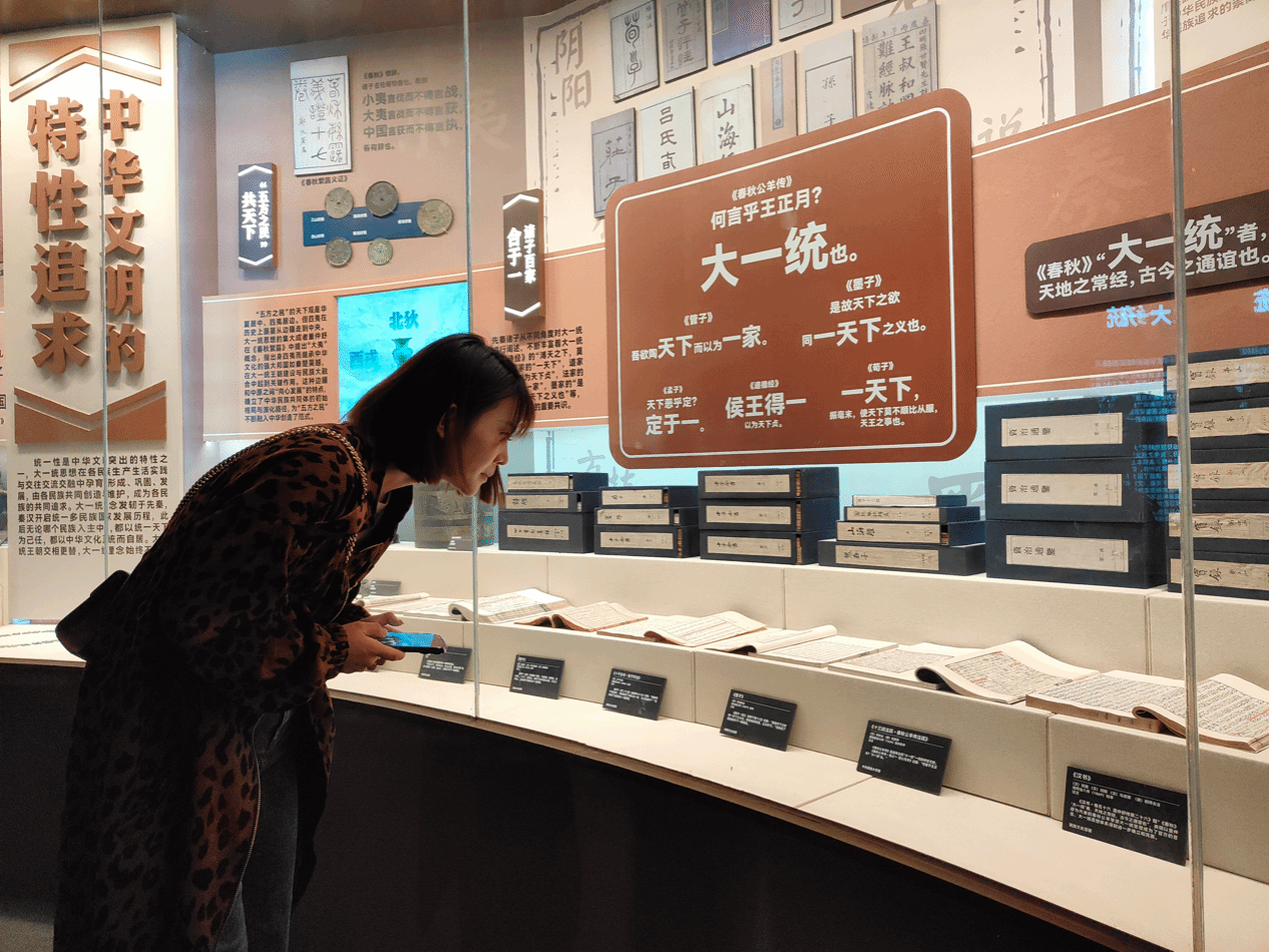走进“大一统”展厅,《春秋公羊传·隐公元年》中记载的“何言乎王正月?‘大一统’也。”这句话引起了大家的注意,在讲解员的介绍下,我们了解到,这是目前可以考证的“大一统”这个词最早出现的记载。“大一统”是中国古代重要的政治理念,也是历代统治者追求的理想局面。几千年来,中华民族始终具有“九州共贯、多元一体”的大一统传统,把大一统看作是“天地之常经,古今之通谊”。中华文明之所以是世界上唯一以国家形态发展至今绵延不断的伟大文明,一个重要的原因就是大一统传统。