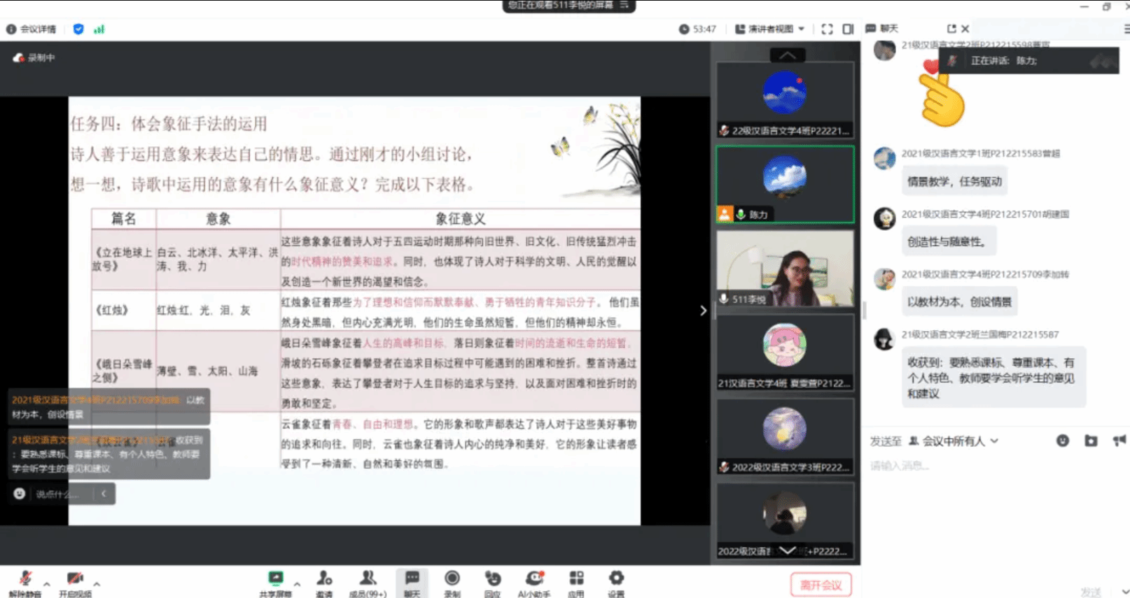 为提高汉语言文学专业学生解读中学语文课程标准与剖析语文教材的能力,中国语言文学学部于6月23日邀请兰州市第八中学的高级教师李悦为学部师生作了以“解读课标智慧,剖析教材精髓:中学语文教学的新视界与深思考”为题的线上讲座,学部共计有五百余名师生积极参与了此次活动。