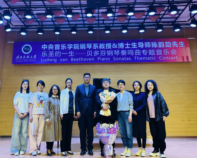 音乐会曲目编排匠心独运,涵盖范围广泛且极具代表性,既有李斯特超技练习曲第六首《幻影》的梦幻绮丽,又有贝多芬f小调第一钢琴奏鸣曲(作品2之1)的庄重深沉;从c小调第八钢琴奏鸣曲《悲怆》(作品13)的激昂悲壮,到升C小调第十四钢琴奏鸣曲《月光》(作品14之2)的静谧悠远;从李斯特超技练习曲《钟》《鬼火》的炫技华彩,到贝多芬第三十号奏鸣曲(Op.109)、第三十二号奏鸣曲(Op.111)的深邃哲思。在观众经久不息的热烈掌声与欢呼声中,陈韵劼教授应观众盛情邀约,返场加演了贝多芬降E大调第二十六钢琴奏鸣曲《告别》(作品81a)第三乐章与斯科里亚宾第四首练习曲,将现场气氛推向了新的高潮。