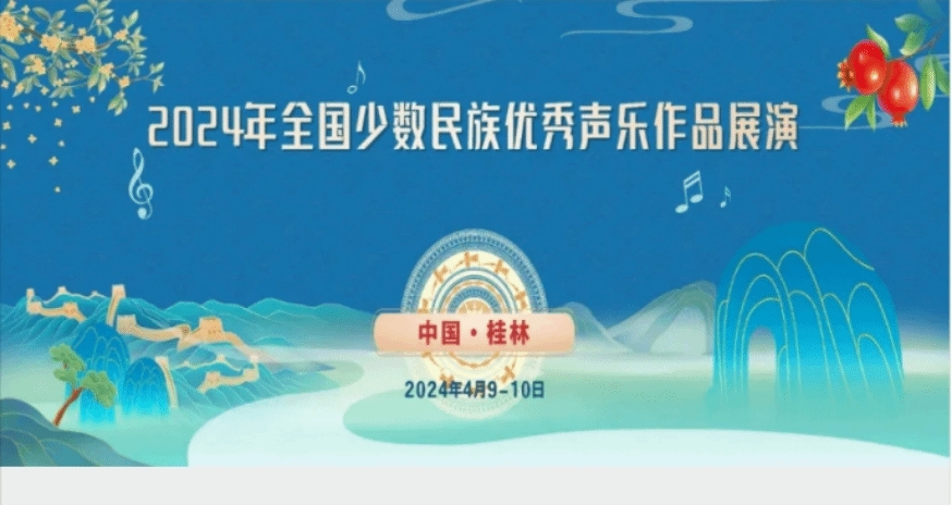 报送的作品《中华吉祥果》成功入选2024年全国少数民族优秀声乐作品展演。该展演由国家民委文化宣传司、文化和旅游部艺术司、广西壮族自治区民族宗教事务委员会等单位联合主办,是我国文化艺术领域的一项重要声乐展演活动。