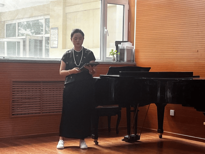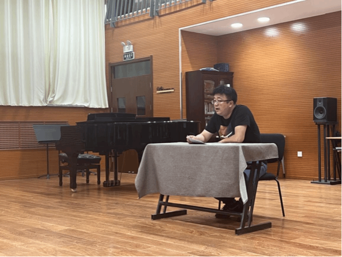 图为马睿老师进行《祖国,慈祥的母亲》的演唱与处理课程授课