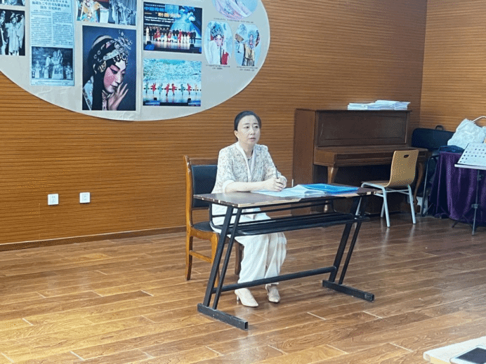 图为马少敏老师进行京剧选段《猛听得金鼓响》作品模唱教唱课程授课