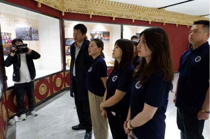 图为甘南藏族自治州文化馆旦正加馆长带领实践团师生参观文化馆非遗展厅。