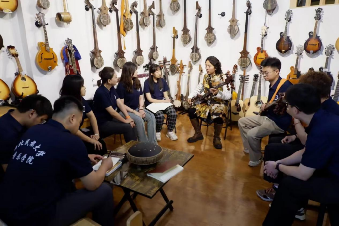 图为道吉才旦老师为实践团师生介绍扎年琴。