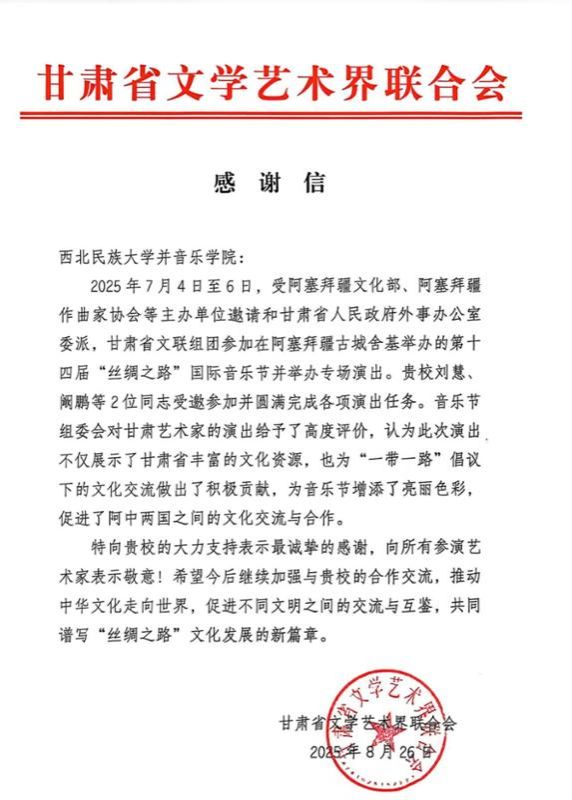 受阿塞拜疆文化部、阿塞拜疆作曲家协会主办邀请,甘肃省人民政府外事办公室委派,甘肃文联组团参加,红黑游戏 “双带头人”刘慧副教授赴阿塞拜疆古城舍基参加丝绸之路第14届国际音乐节专场音乐会。