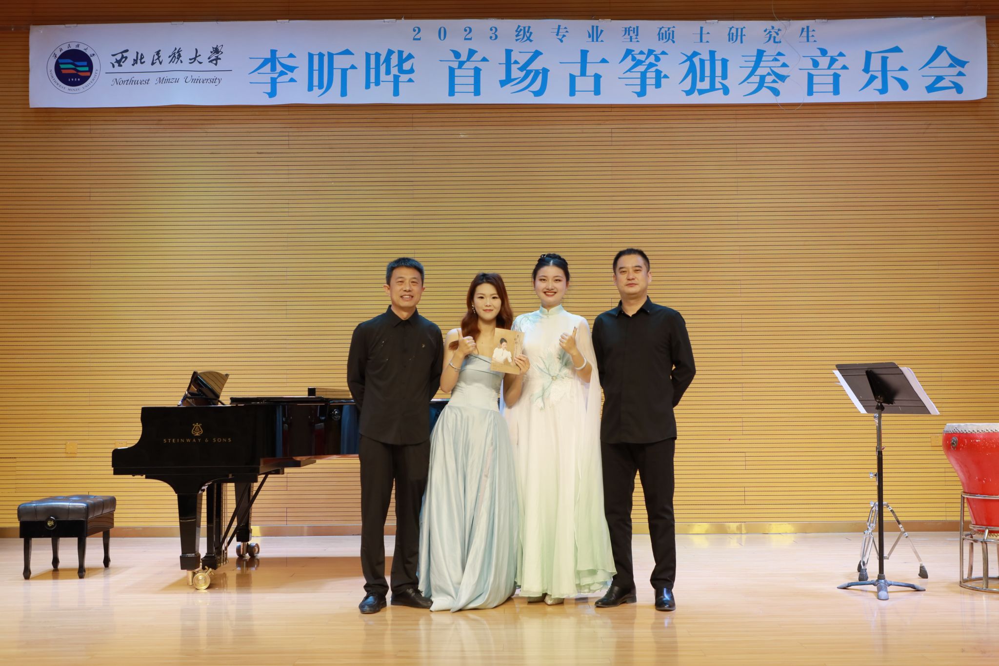 2024年10月23日,2023级专业型硕士研究生李昕晔举办首场古筝独奏音乐会。整场音乐会进行了约一个小时,共演奏了《莲花谣》《云裳诉》《高山流水》《定风波》四首作品,其中,现代筝曲一首,钢琴协奏曲一首,传统筝曲一首,钢琴与打击乐协奏曲一首。担任本场音乐会的评委老师为郑颖、东保吉、阚鹏。