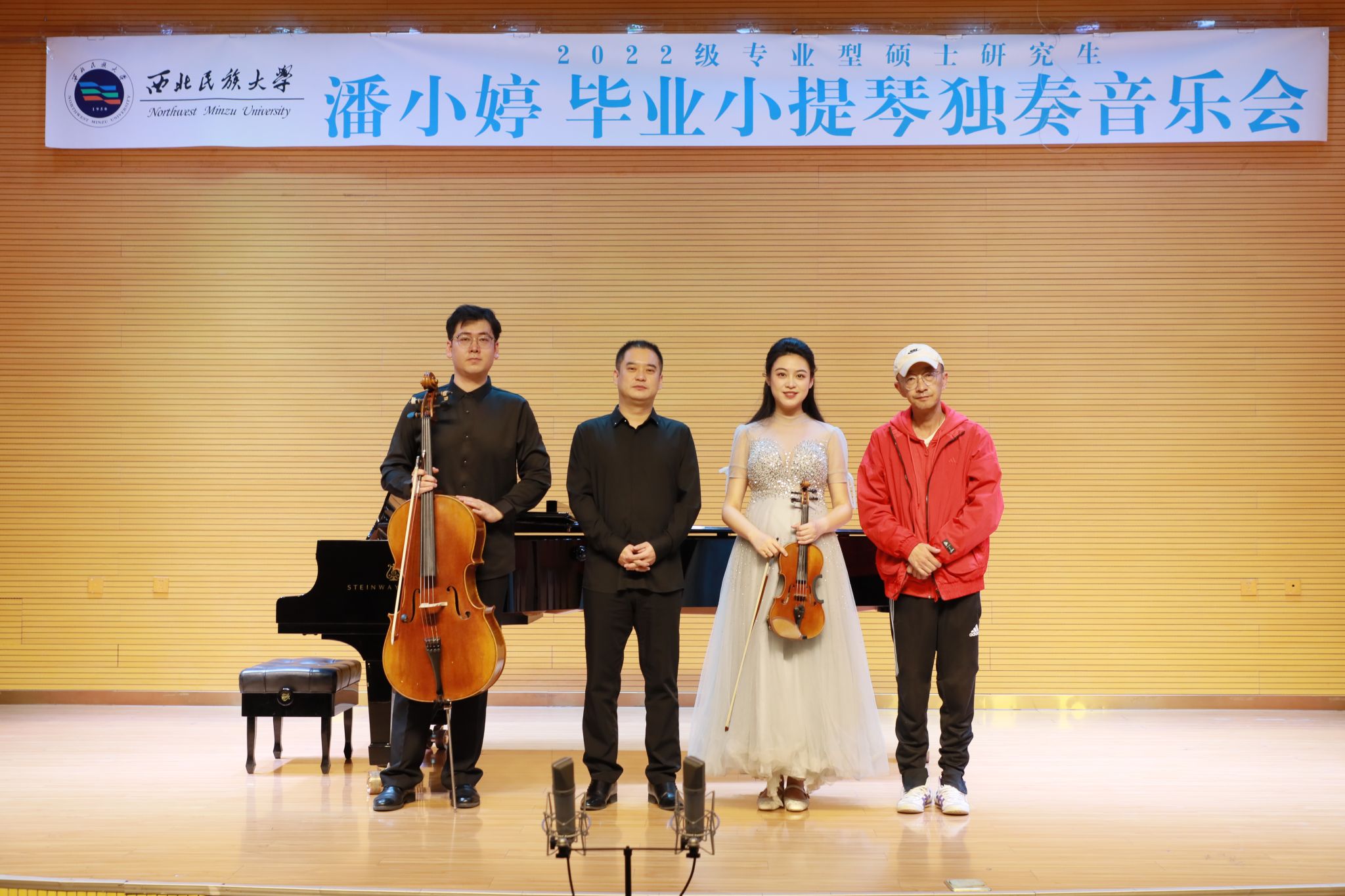 2024年10月21日,2022级专业型硕士研究生潘小婷成功举办小提琴毕业音乐会。整场音乐会历时一个小时,共演奏了4首小提琴作品。分别是:杨善乐《夏夜》、雷振邦《花儿为什么这样红》、沃尔夫冈·阿马德乌斯·莫扎特《G大调第18号小提琴和钢琴奏鸣曲,K.301(K.293a)》全乐章以及重奏曲弗朗茨·约瑟夫·海顿《D大调钢琴、小提琴和大提琴三重奏》第一、二乐章。音乐会艺术指导由卜文涛老师担任,特邀嘉宾吴皓秋。参加本场音乐会的评委老师有杨艳霞、钟力、马波。