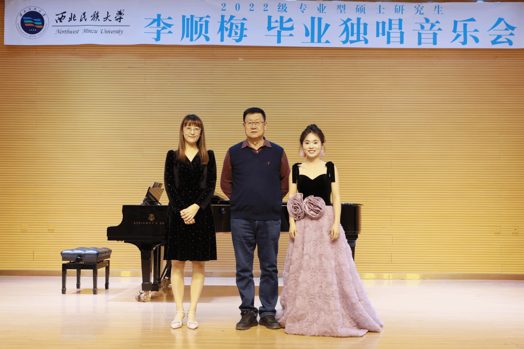 2024年11月1日,2022级专业型硕士研究生李顺梅举办毕业独唱音乐会。整场音乐会历时一小时,共演唱《丢失发针,我多么悲伤》《阿尔卑斯山的牧羊女》《帕米尔,我的家乡多么美》《我爱你》等十二首作品。其中中国古诗词艺术歌曲四首,歌剧咏叹调三首,外国艺术歌曲三首,创作歌曲两首。本场音乐会艺术指导由郭倩担任,参加本场音乐会的评委老师有李凤莲、赵炜民、朱子健。主持人闫倩。