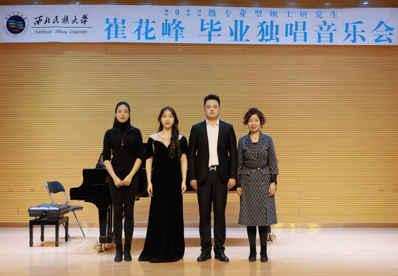 2024年11月5日,2022级专业型硕士研究生崔花峰举办毕业独唱音乐会。音乐会历时一个小时,共演唱了《在灿烂鲜艳的五月里》《走进香巴拉》《负心人》《那就是我》等十二首作品,其中艺术歌曲四首,拿波利民歌四首,创作歌曲两首,古诗词艺术歌曲两首。本场音乐会艺术指导由刘一芃老师担任,参加本场音乐会的评委老师有李凤莲、赵炜民、朱子建。闫倩主持。