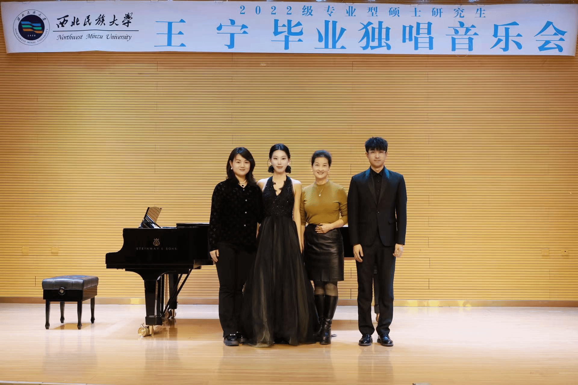 2024年11月5日下午14:00,2022级专业型硕士研究生王宁举办毕业独唱音乐会。整场音乐会历时一个小时。共演唱了《别再使我痛苦迷惘》《我怀着满腔热情》《迎接》《越人歌》等十二首作品,其中意大利语作品两首,法语作品两首,韩国艺术歌曲一首,中国艺术歌曲两首,中国民族歌剧选段歌曲两首,创作歌曲三首。本场音乐会艺术指导由陈华老师担任,参加本场音乐会的评委老师有李凤莲、赵炜民、朱子健,郭璇主持。