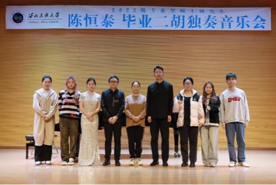 2024年11月12日上午10点,2022级专业型硕士研究生陈恒泰成功举办毕业二胡独奏音乐会。整场音乐会历时一小时,共演奏《天山风情》《楚颂》《月夜》《初心》四首作品。本场音乐会艺术指导由史洋老师担任,主持人邵晨;参加本场音乐会的评委老师有刘慧、东保吉、王洁。