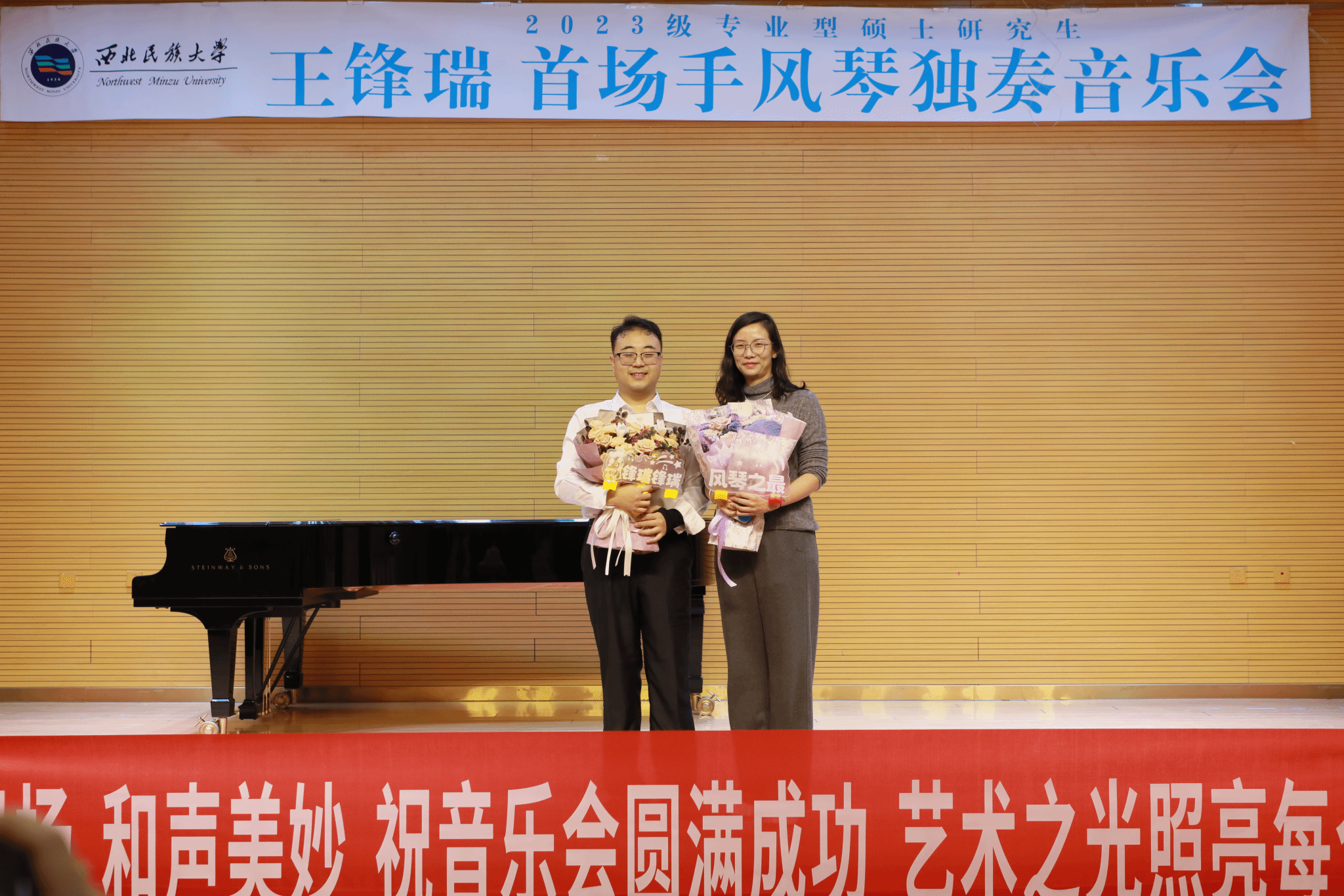 2024年11月7日上午十一点,2023级专业型硕士研究生王锋瑞成功举办首场手风琴独奏音乐会。整场音乐会将近一个小时,共演奏了《b小调前奏曲与赋格BWV893》《长城》《berceuse》《E大调奏鸣曲》《托卡塔一号(必弹曲目)》《茉莉花》《送我一支玫瑰花》七首作品,其中独奏曲五首,手风琴二重奏两首。本场音乐会特邀嘉宾魏琦珊同学。参加本场音乐会的评委有孟玫、王艺涵、刘一芃。