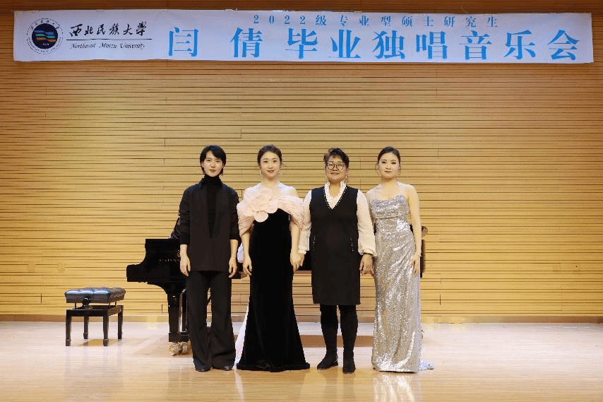 2024年11月15日上午11点00分,2022级专业型硕士研究生闫倩成功举办毕业独唱音乐会。整场音乐会历时一个小时,共演唱了《野玫瑰》《我感到》《帕米尔我的家乡多么美》《我爱这土地》等十二首作品,其中外国作品三首,中国古诗词歌曲三首,中国艺术歌曲五首,创作歌曲一首。本场音乐会艺术指导由张金松老师担任,参加本场音乐会的评委老师有韩华、黄锦、马睿。主持人尹桐灵。