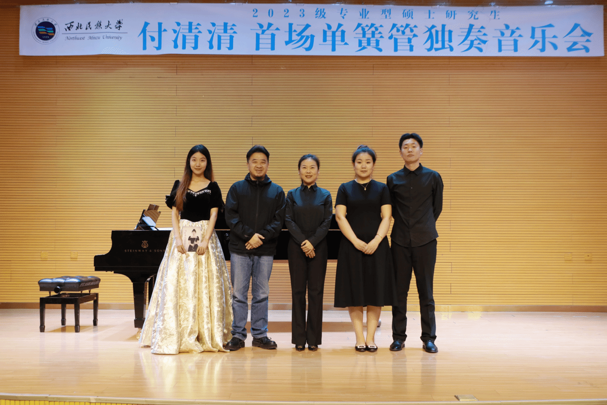 2024年11月18日,2023级专业型硕士研究生付清清成功举办首场单簧管独奏音乐会。整场音乐会历时1小时,共演奏三首曲目:莫扎特《A大调单簧管协奏曲》、路易吉•巴斯《清教徒主题幻想曲》、弗朗兹•克拉玛《降E大调单簧管二重奏协奏曲》。本场音乐会艺术指导由王艳丽老师担任,参加本次音乐会的评委老师有:杨艳霞,马波,李朝华。