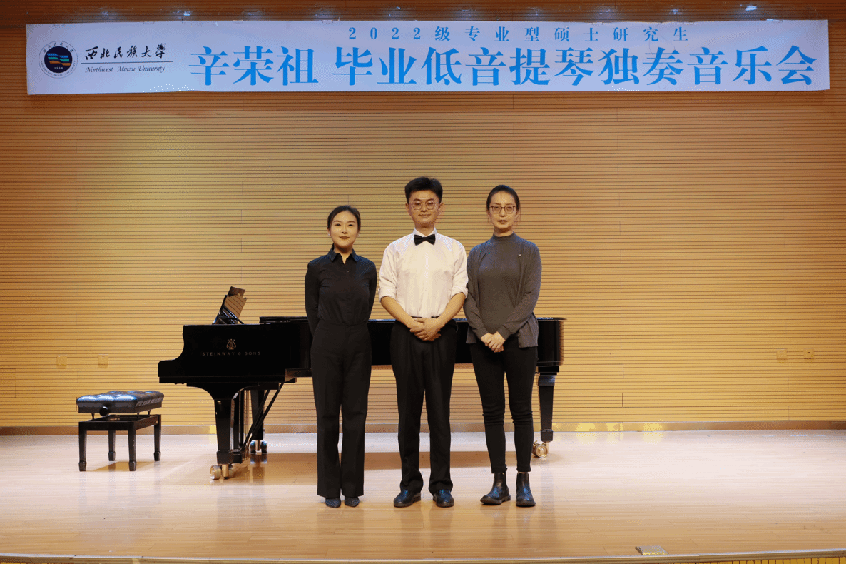 2024年11月11日,2022级专业型硕士研究生辛荣祖成功举办毕业低音提琴独奏音乐会。整场音乐会历时一个小时,共演奏了必奏曲目《库赛维斯基#f小调低音提琴协奏曲》全乐章、《博泰西尼b小调低音提琴协奏曲》第一乐章、《格里埃尔为低音提琴和钢琴而作的四首小品》的《前奏曲》与《塔兰泰拉舞曲》,共三首作品。本场音乐会艺术指导由王艳丽老师担任,参加本场音乐会的评委老师有刘畅、宁辉、杨艳霞,肖靖川主持。