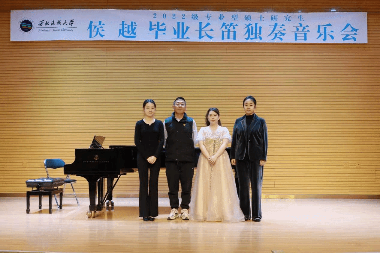 2024年11月11日,2022级专业型硕士研究生侯越成功举办毕业长笛独奏音乐会。整场音乐会历时一个小时,共演奏了《勃罗德克D大调长笛协奏曲》《高伯特夜曲与快板谐谑曲》《乔治·胡幻想曲》《阳光灿烂照天山》《长笛二重奏<魔笛>》五首作品。本场音乐会艺术指导由李宛泽老师担任,主持人李家蕙。参加本场音乐会的评委老师有刘畅老师、宁辉老师、杨艳霞老师。