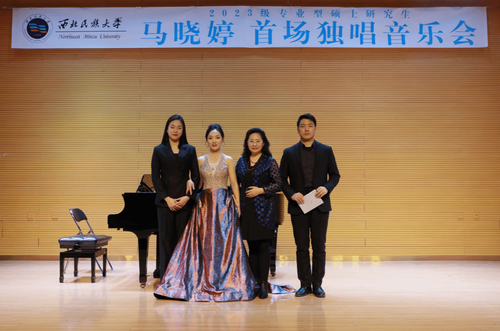 2024年11月29日下午五点,2023级专业型硕士研究生马晓婷成功举办首场独唱音乐会。参加本场音乐会的评委老师有红霞、郉延青、尹辉。 整场音乐会历时一小时,共演唱选自《妇女的爱情与生活》声乐套曲中的八首作品、《一个黑人姑娘在歌唱》《共和国之恋》《奶水、血水、泪水》《赤子情》十二首作品。本场音乐会艺术指导由刘一芃老师担任,主持人李小龙。