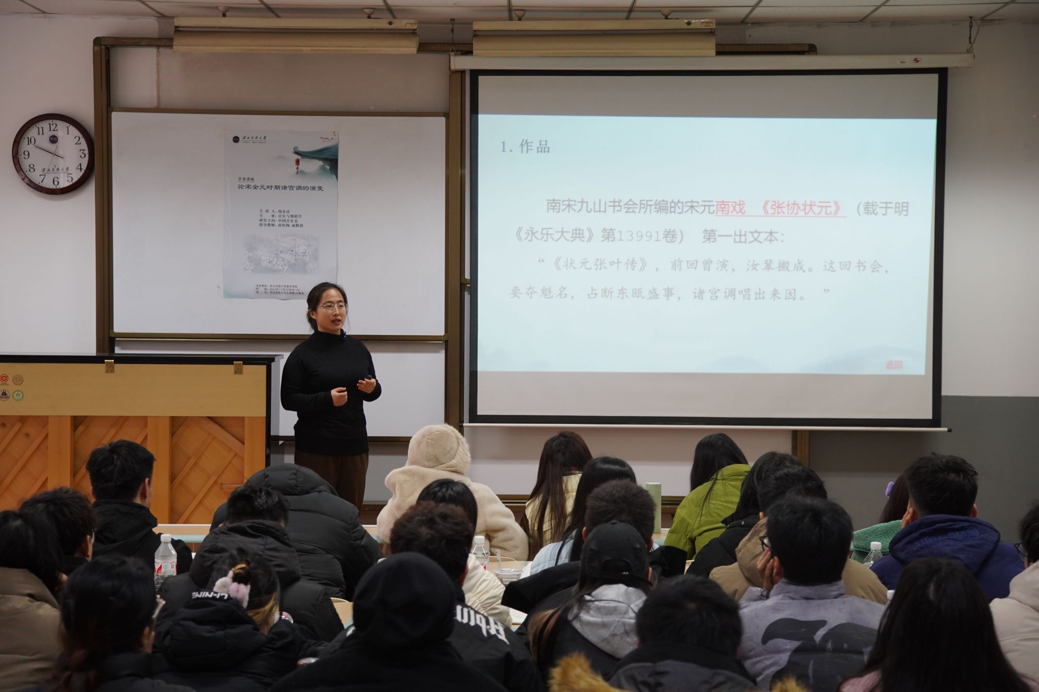 2024年11月29日9:35,2022级学术型硕士研究生周永彦成功举办学术讲座。讲座历时45分钟,讲座题目为论宋金元时期诸宫调的演变。讲座内容共分为:诸宫调的界定、宋金元时期诸宫调的形成、宋金元时期诸宫调的发展、宋金元时期诸宫调的演变特征、结论五个部分。本次讲座由黄炜教授、陈艺教授、王珊副教授三位老师担任评委。