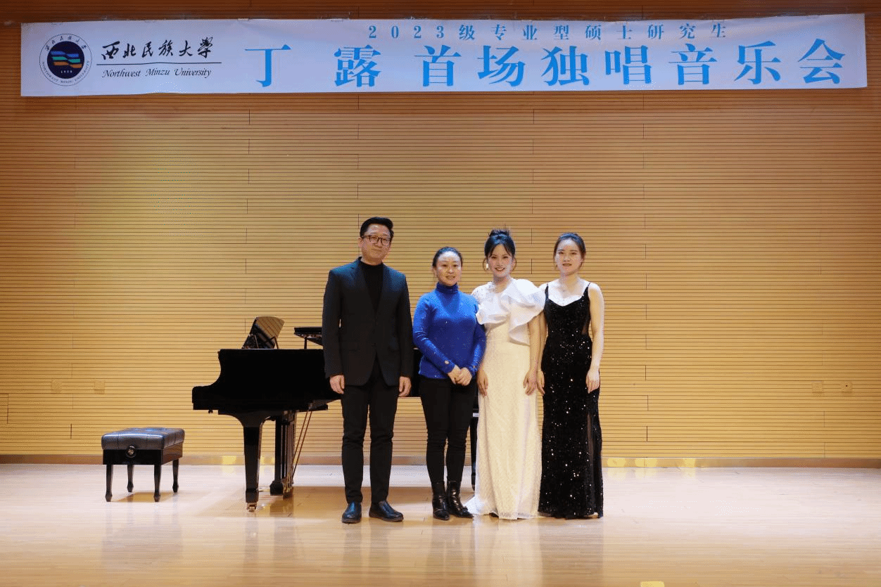 2024年11月29日下午三点半,2023级专业型硕士研究生丁露成功举办首场独唱音乐会。参加本场音乐会的评委老师有红霞、邢延青、尹辉。整场音乐会历时一个小时,共演唱了《玫瑰三愿》《钗头凤》《紫罗兰》《主人,您听我说》等十二首作品,其中中国艺术歌曲三首,外国歌剧选段四首,中国古诗词歌曲两首,民族歌剧选段一首,外国艺术歌曲两首。本场音乐会艺术指导由杜春辉老师担任,主持人侍谷锦。