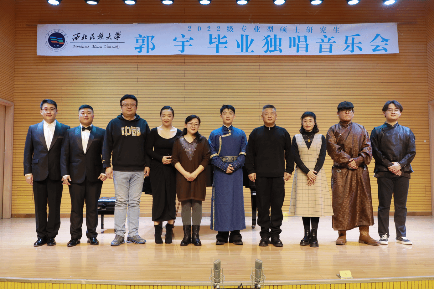 2024年12月2日17时,2022级专业型硕士研究生郭宇成功举办毕业独唱音乐会。整场音乐会历时一个小时,共演唱了《重归苏莲托》《你是我心中的一切》《小夜曲》《那就是我》等十三首作品,其中意大利民歌两首,外国艺术歌曲两首,外国歌剧选段一首,中国艺术歌曲六首,中国歌剧选段一首,内蒙古民歌一首。本场音乐会艺术指导由马岚老师担任,参加本场音乐会的评委老师有韩华、马睿、赵炜民。主持人董冠奇。