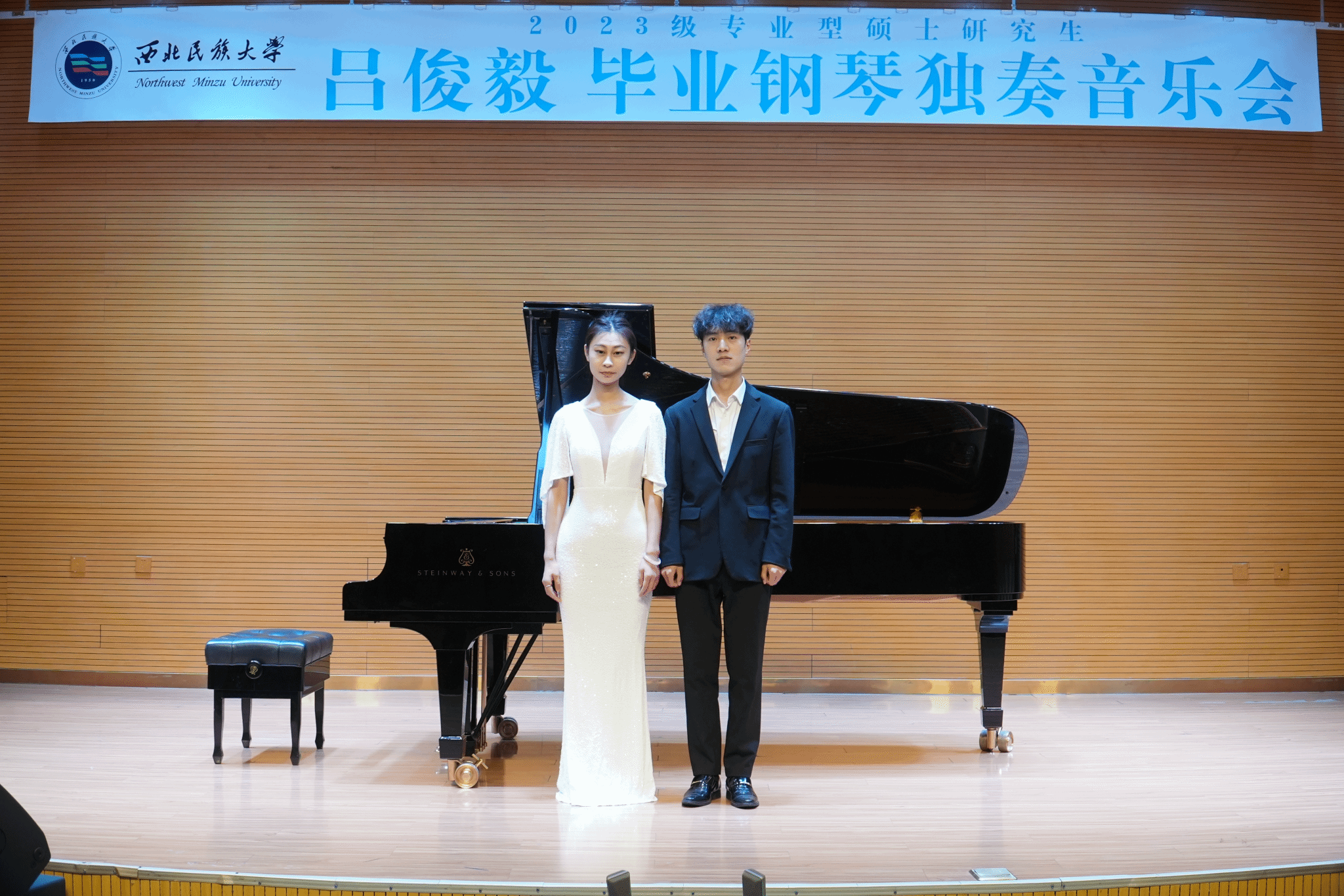 2025年10月23日上午11点,2023级专业型硕士研究生吕俊毅成功举办毕业独奏音乐会。 整场音乐会进行了约一个小时,共演奏了四首作品。分别是《降A大调波兰舞曲“英雄”Op.53》《菲利普·格拉斯练习曲No.5 No.6》《c小调第五钢琴奏鸣曲Op.10 No.1》《b小调第一谐谑曲》。 担任本场音乐会的评委老师为孟玫、刘一芃、滕丽民。