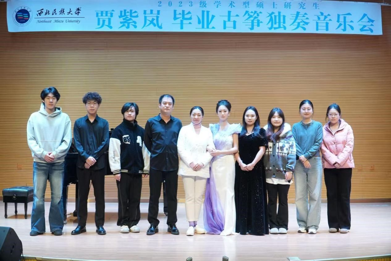 2025年11月4日11:00,2023级学术型硕士研究生贾紫岚成功举办毕业古筝独奏音乐会。 整场音乐会全程一小时,共演奏了《醉京斓》《铁马吟》《珠荷吟》《行者》四首作品,其中现代作品三首,传统作品一首。 本场音乐会艺术指导卜文涛老师,主持人刘佳楠。管民、王洁、东保吉三位老师担任评委。