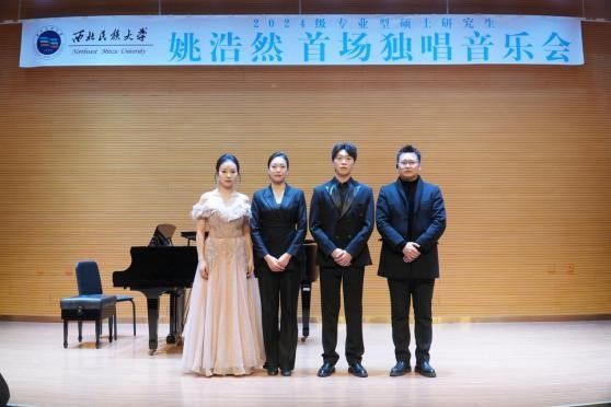 2025年11月4日17:00,2024级专业型硕士研究生姚浩然成功举办首场独唱音乐会。 参加本场音乐会的评委老师有红霞老师、邢延青老师、尹辉老师。整场音乐会历时一个小时,共唱了《绿树成荫》《像天使—样美丽》《你想要跳舞吗?我的小伯爵》《仙女的眼睛》《被禁止的音乐》《让我们携手同行》等十二首作品。其中,外国作品六首:三首歌剧咏叹调、两首艺术歌曲、 —首歌剧二重唱;中国作品六首:古诗词艺术歌曲三首、创作歌曲三首。 本次音乐会艺术指导由刘—芃老师担任,主持人沈妍娜,特邀嘉宾田亚男。