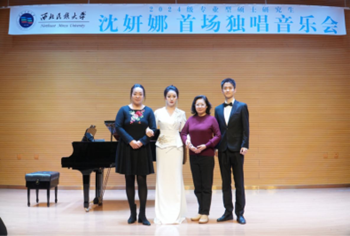 2025年11月7日17:00, 2024级专业型硕士研究生沈妍娜成功举办首场独唱音乐会。 这场音乐会进行了约—个小时,共演唱了十二首作品,分别是:《假如你爱我》《阿尔卑斯山的牧羊女》《漫步街上》《—杯美酒》《包楞调》《三月桃花心中开》《念奴娇·赤壁怀古》《定风波·莫听穿林打叶声》《更漏子·玉炉香》《诉衷情》《相思》《飞天》。 音乐会艺术指导由马岚老师担任,主持人王皓玮,本场音乐会的评委老师有红霞老师、尹辉老师、邢延青老师。