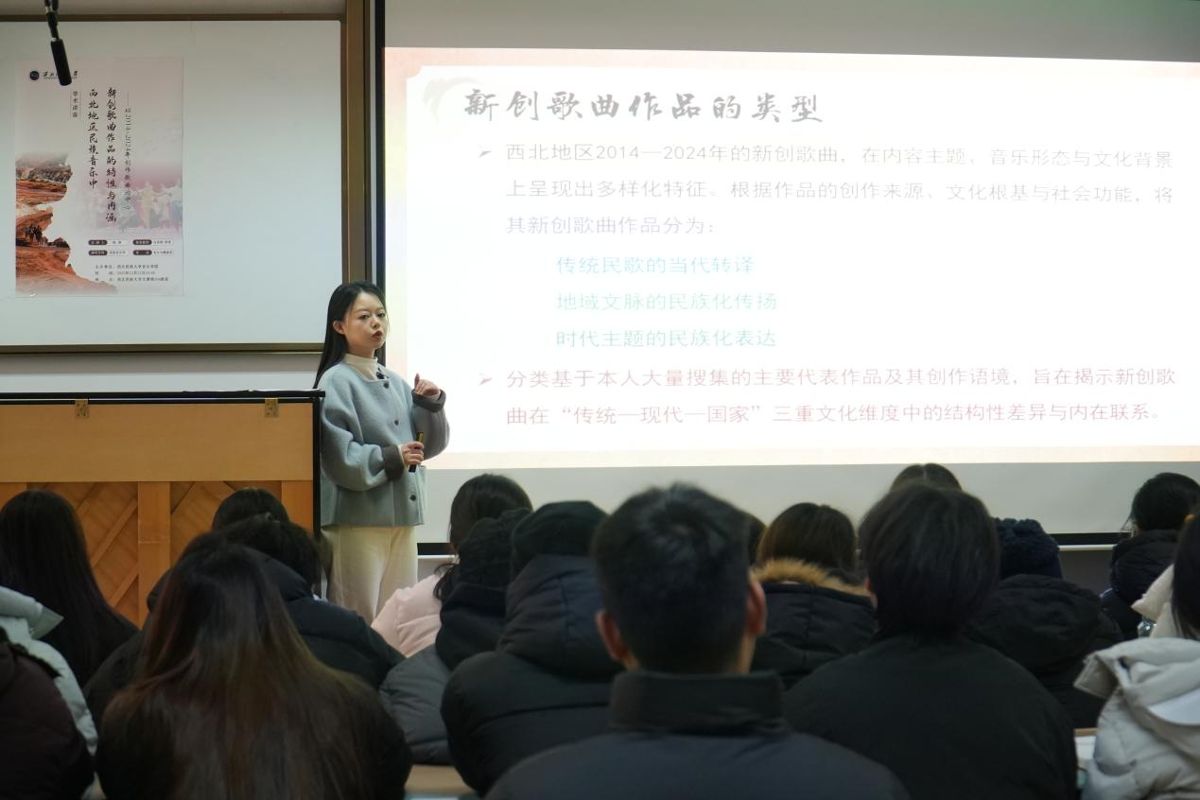 2025年12月11日,2023级学术型硕士研究生杨涛成功举办学术讲座。 讲座历时45分钟,讲座题目为“西北地区民族音乐中新创歌曲作品的特性与内涵——以2014-2024年创作歌曲为中心”。讲座内容共分为新创歌曲作品的定义、新创歌曲作品的类型、新创歌曲作品的表现特征、新创歌曲作品的内涵阐释四个部分。 本次讲座由薛松梅副教授、陈艺教授、王珊副教授三位老师担任评委。