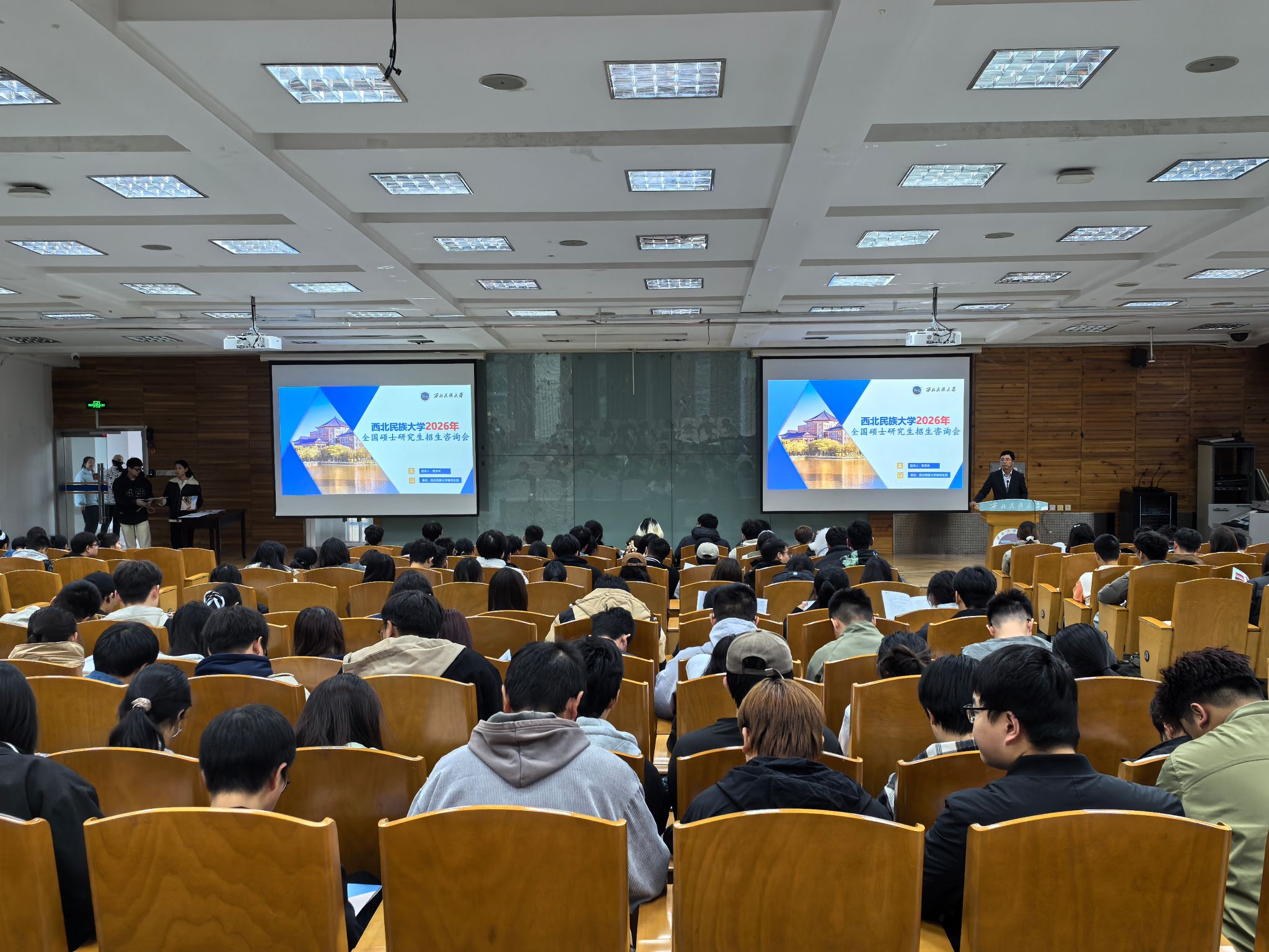 2026年硕士研究生招生情况和专业特色,鼓励考生以第一志愿报考,并科学备考、积极应考。招生办公室工作人员对2026年招生简章与专业目录作了系统解读,围绕报考条件、考试科目、志愿填报等高频问题答疑,并就专业选择、复试录取等与考生现场交流,气氛热烈。会后,在两校区同步发放招生简章2600余份,为有意考研的学生提供权威信息参考。